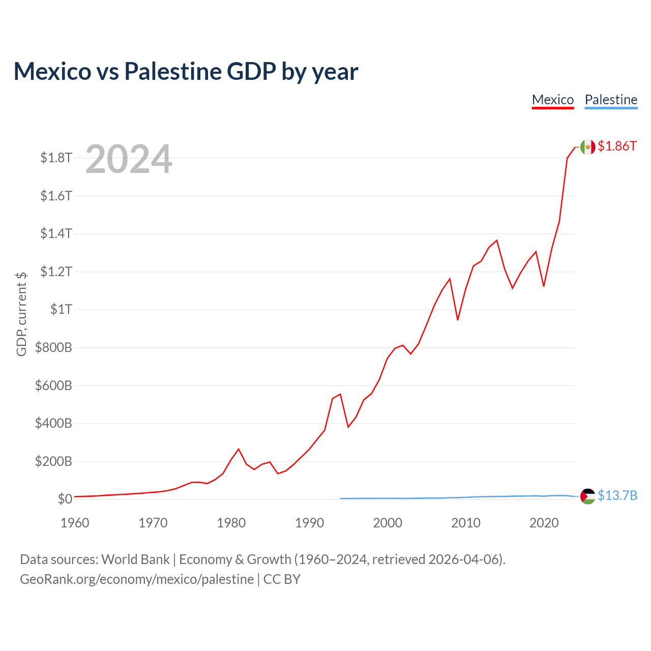 Mexico has a GDP of $1.86T compared to $13.7B for Palestine, ranking 13/197 and 146/197 by economy size, respectively.