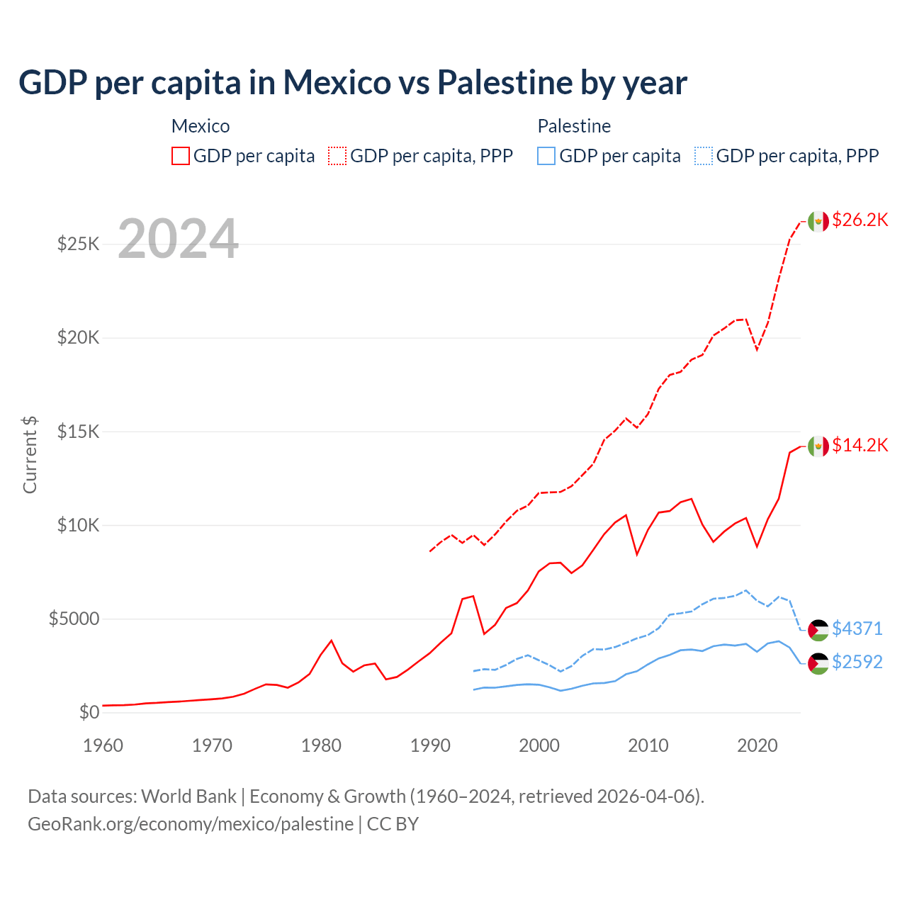 GDP per capita in Mexico vs Palestine by year