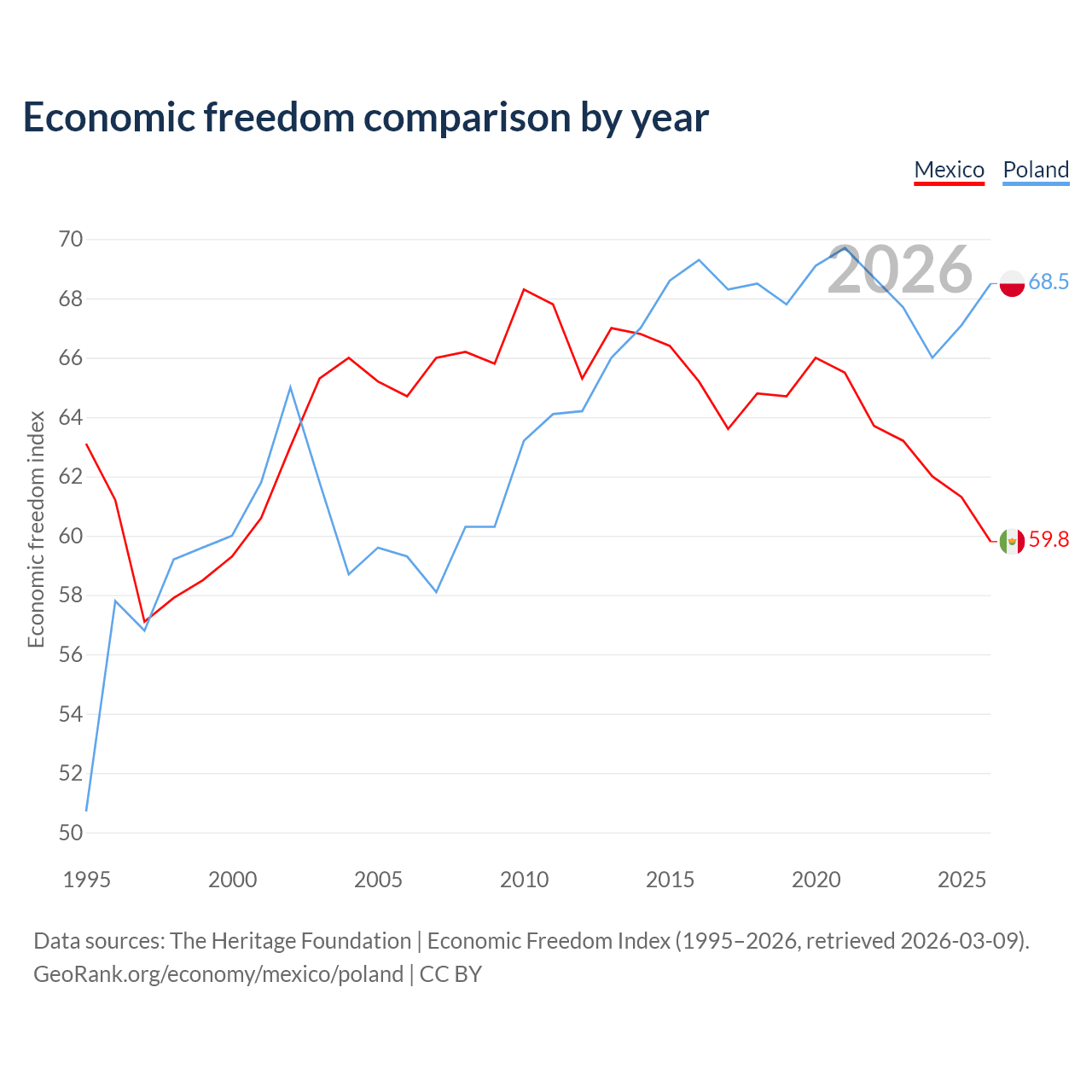 Data sources: The Heritage Foundation | Economic Freedom Index (1995–2026, retrieved 2026-03-09).