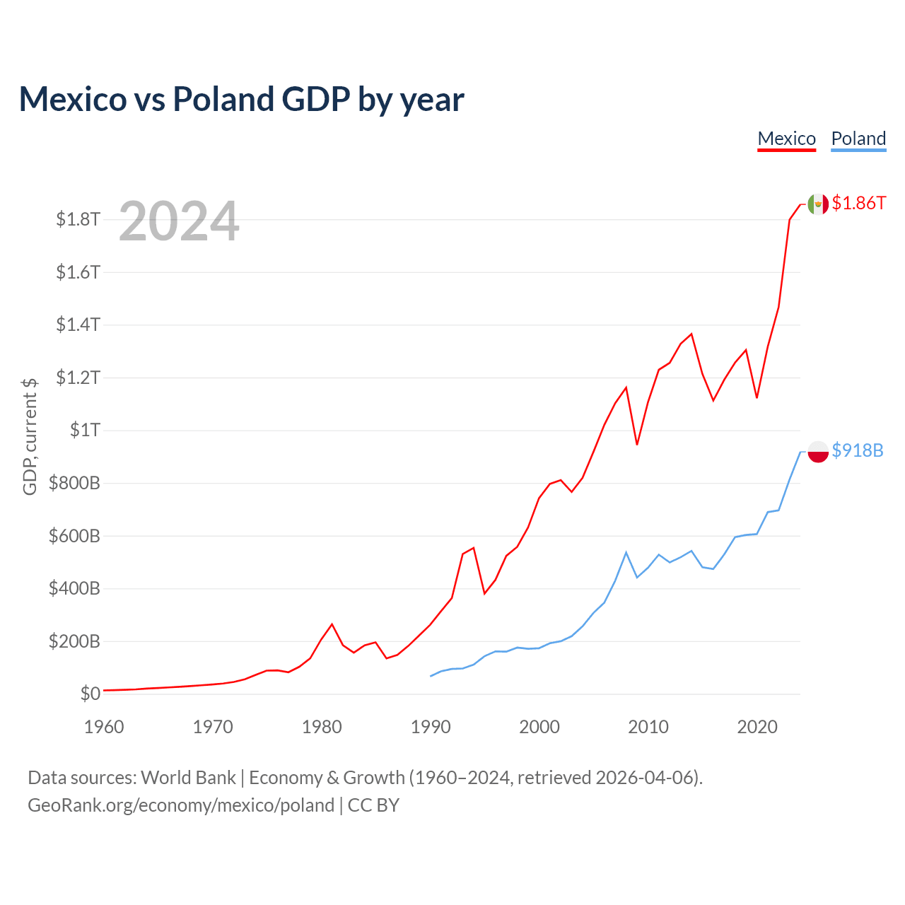 Mexico has a GDP of $1.86T compared to $918B for Poland, ranking 13/197 and 21/197 by economy size, respectively.