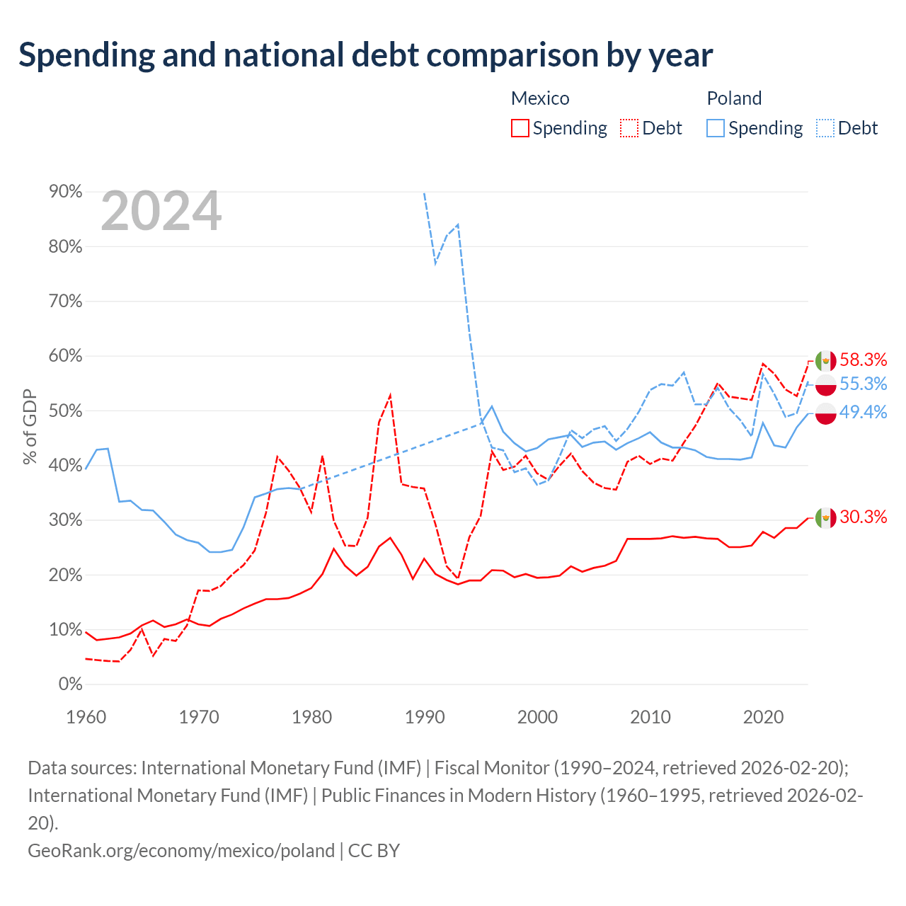 Mexico has $1.08T in government debt (58.3% of GDP), compared to $507B (55.3% of GDP) in Poland.