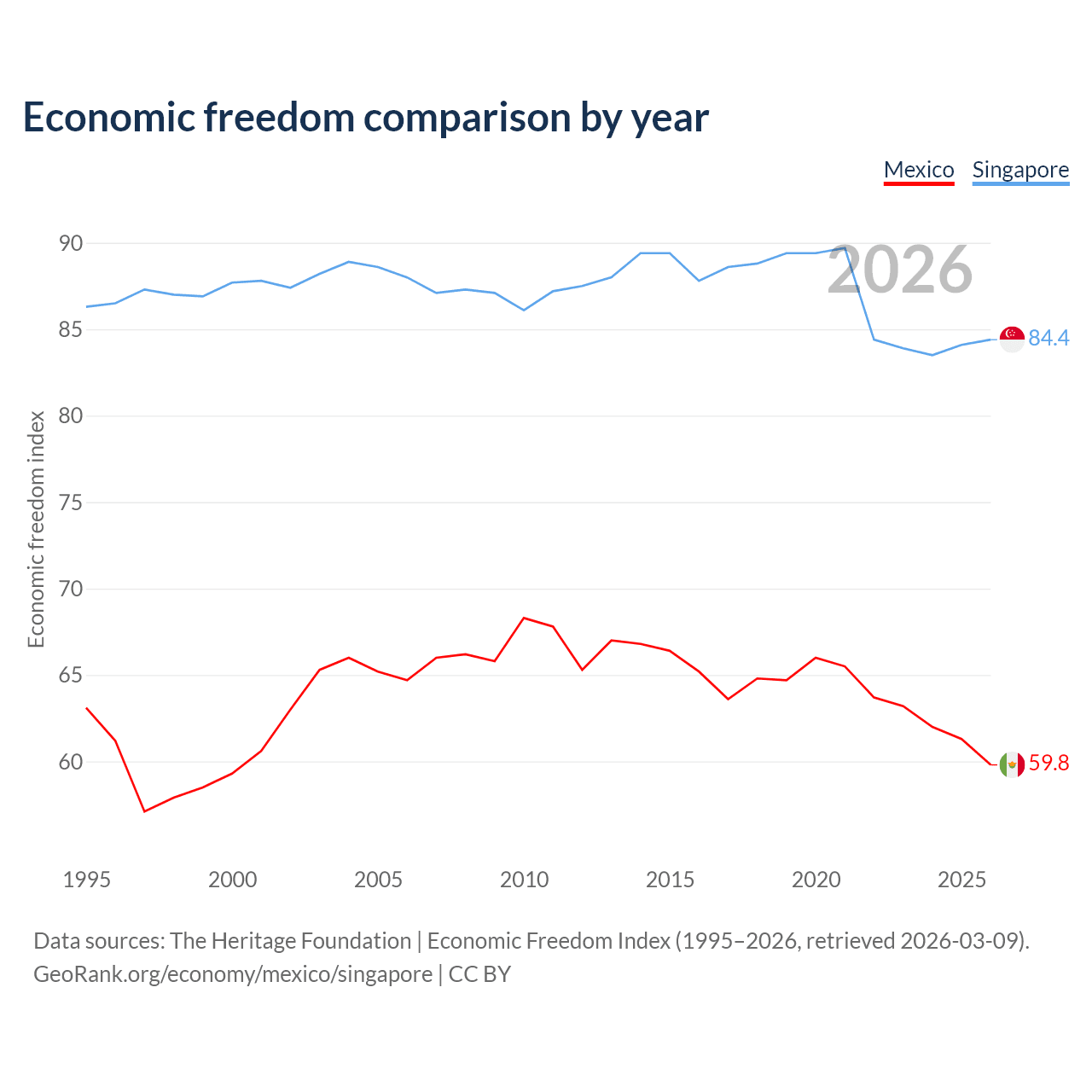 Data sources: The Heritage Foundation | Economic Freedom Index (1995–2026, retrieved 2026-03-09).