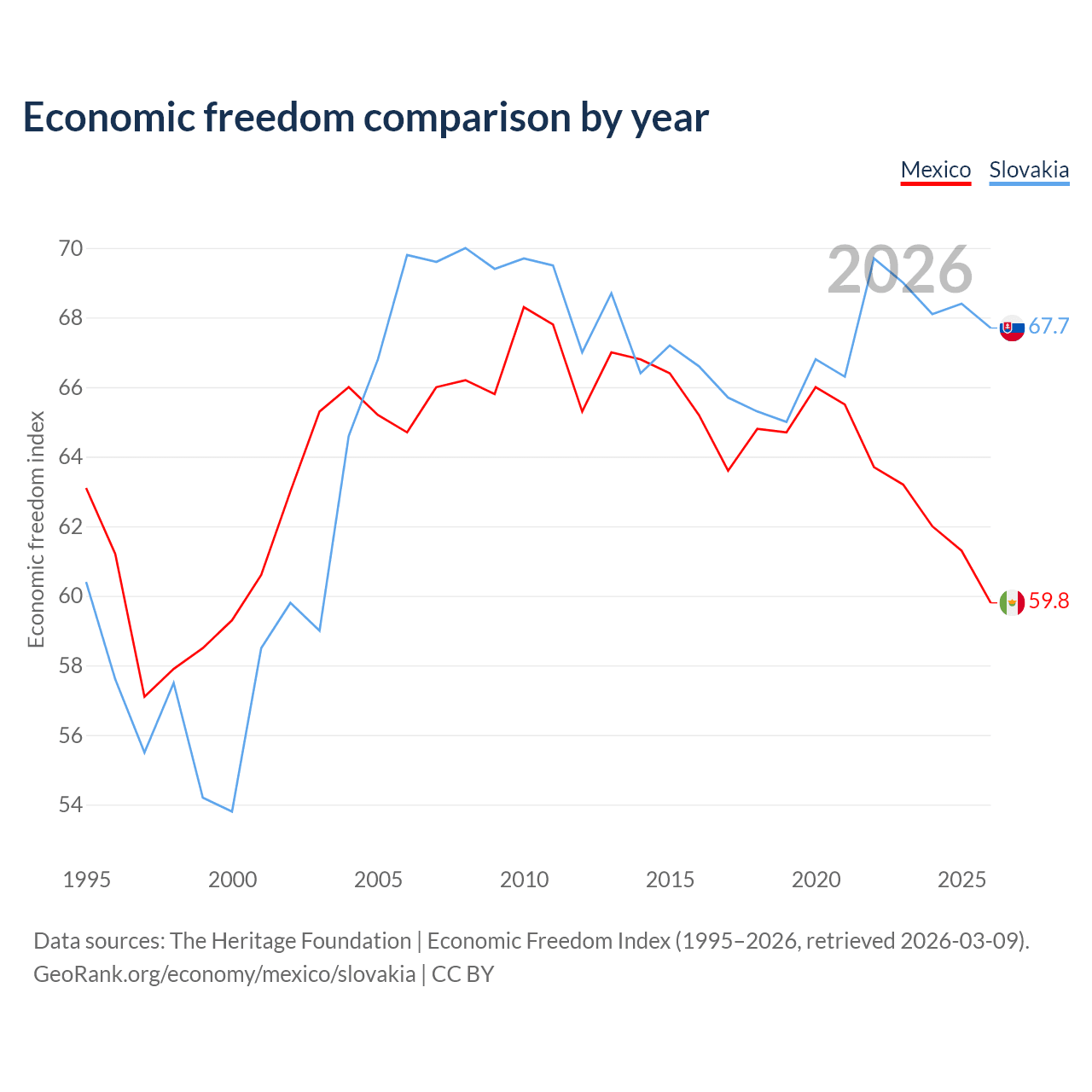 The Economic Freedom Index for Mexico is 59.8, ranking 102/197, compared to 67.7 for Slovakia, ranking 54/197. The chart above displays a comparison of annual changes in economic freedom indexes.