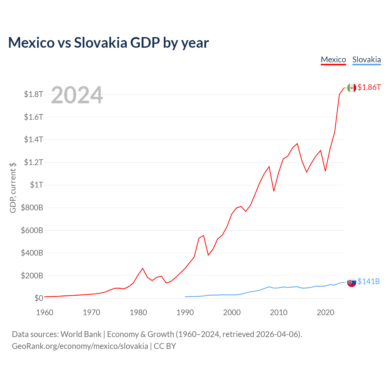 Mexico has a GDP of $1.86T compared to $141B for Slovakia, ranking 13/197 and 61/197 by economy size, respectively.