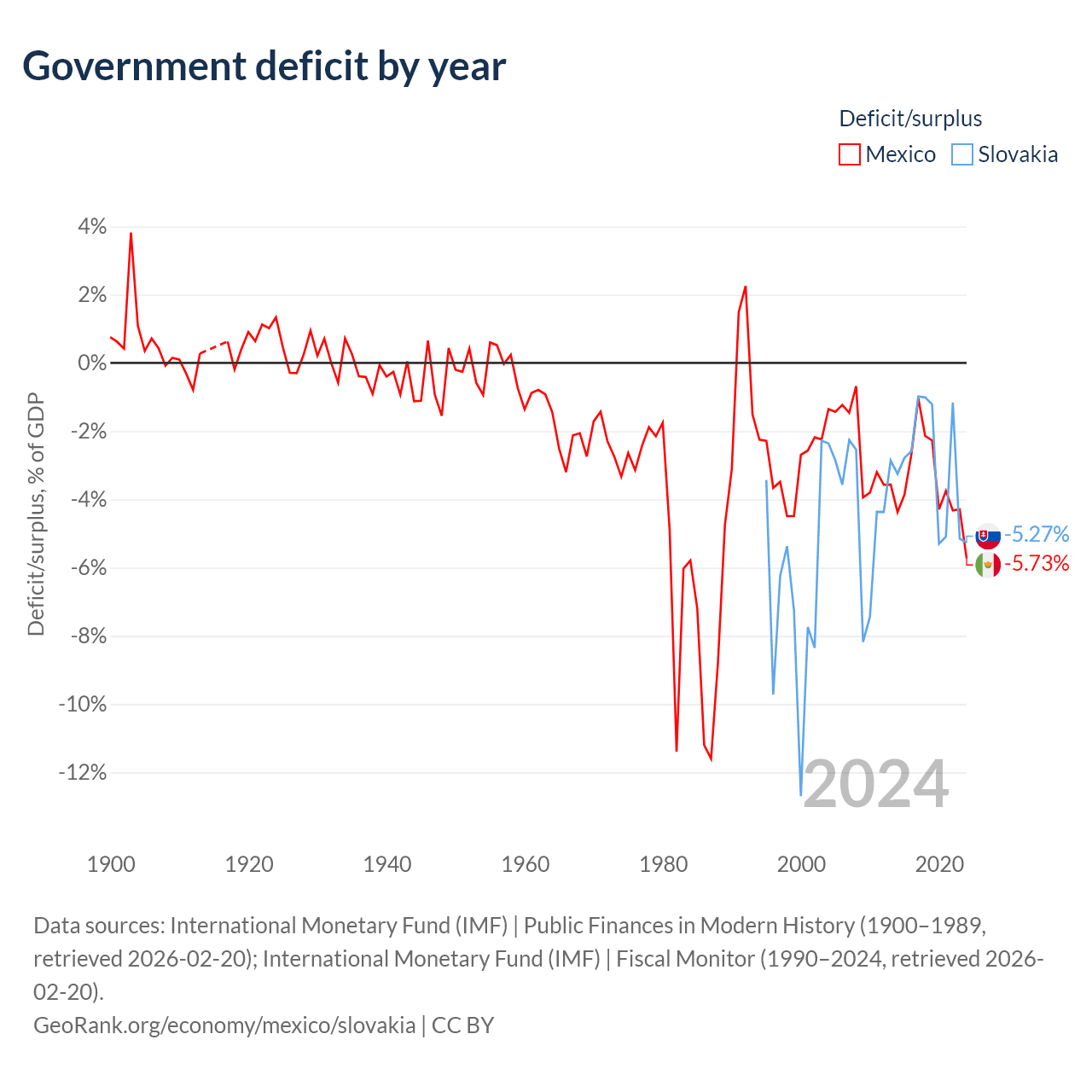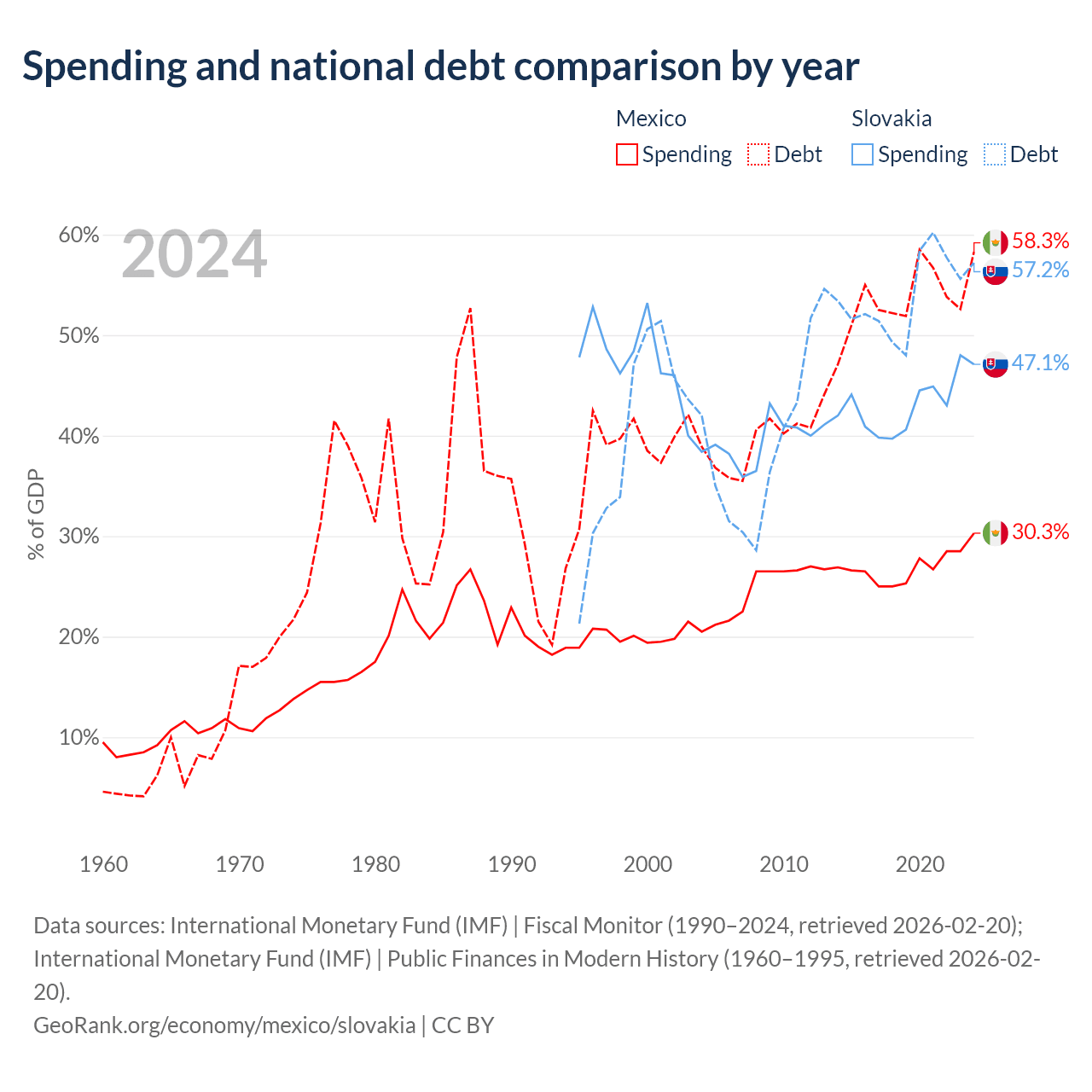 Mexico has $1.08T in government debt (58.3% of GDP), compared to $80.7B (57.2% of GDP) in Slovakia.