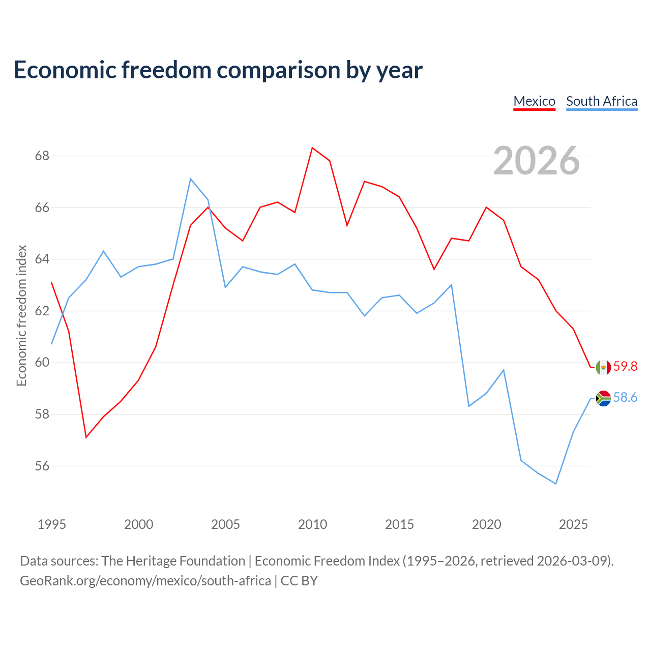 Data sources: The Heritage Foundation | Economic Freedom Index (1995–2026, retrieved 2026-03-09).