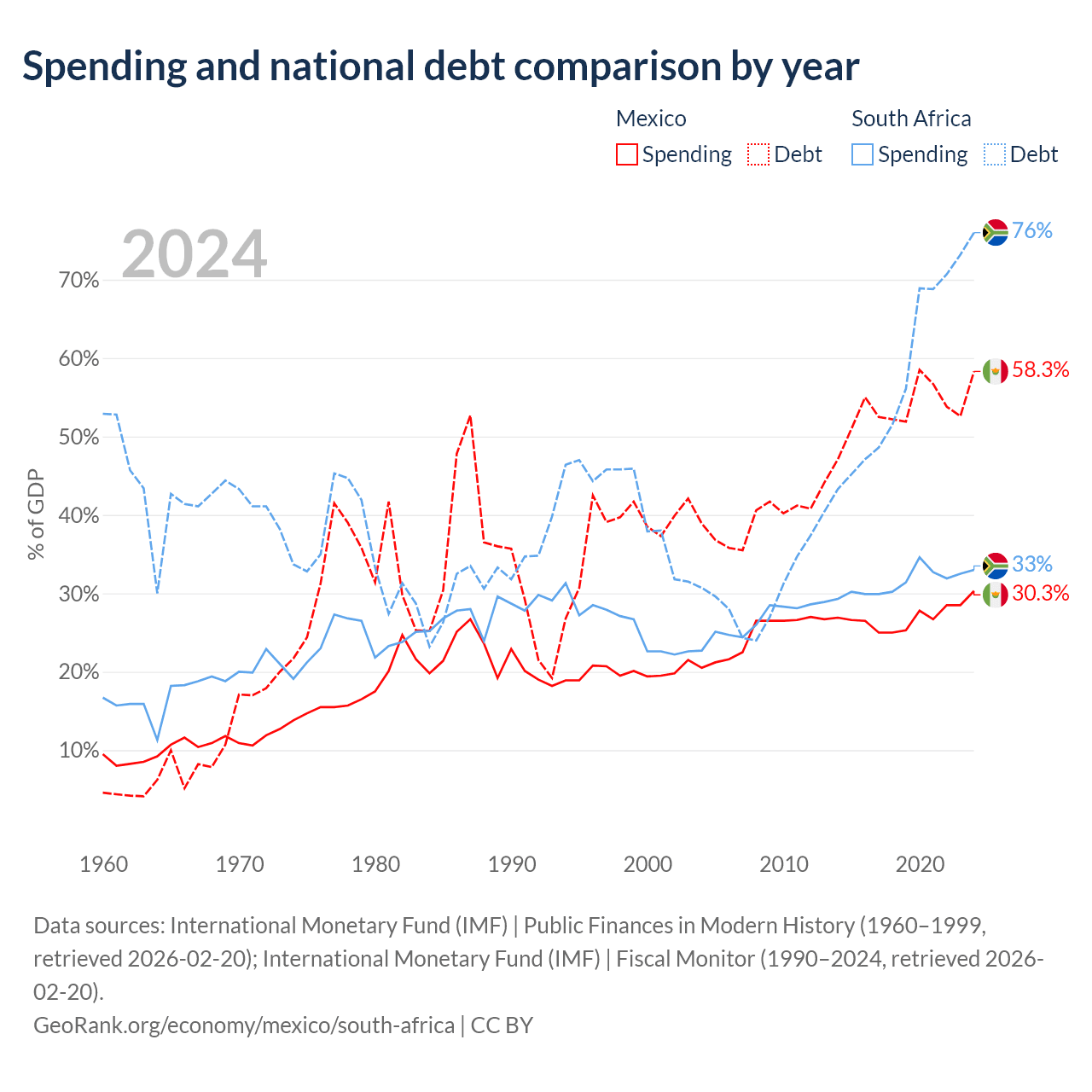 Mexico has $1.08T in government debt (58.3% of GDP), compared to $305B (76% of GDP) in South Africa.