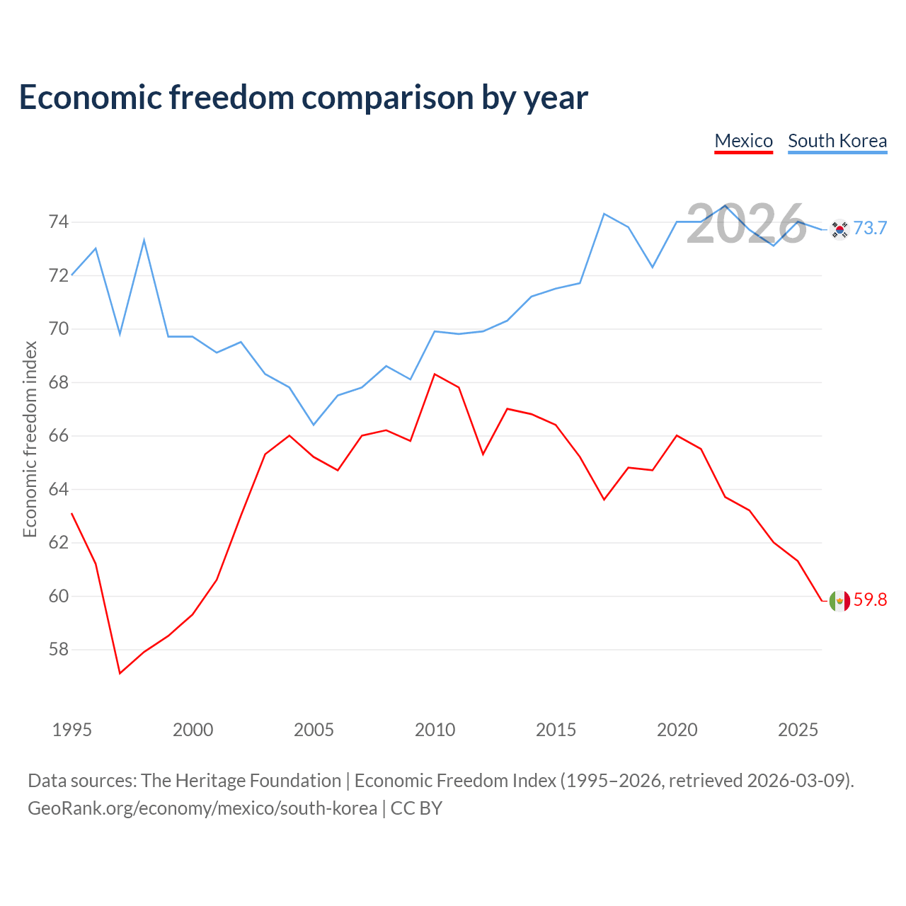 The Economic Freedom Index for Mexico is 59.8, ranking 102/197, compared to 73.7 for South Korea, ranking 24/197. The chart above displays a comparison of annual changes in economic freedom indexes.