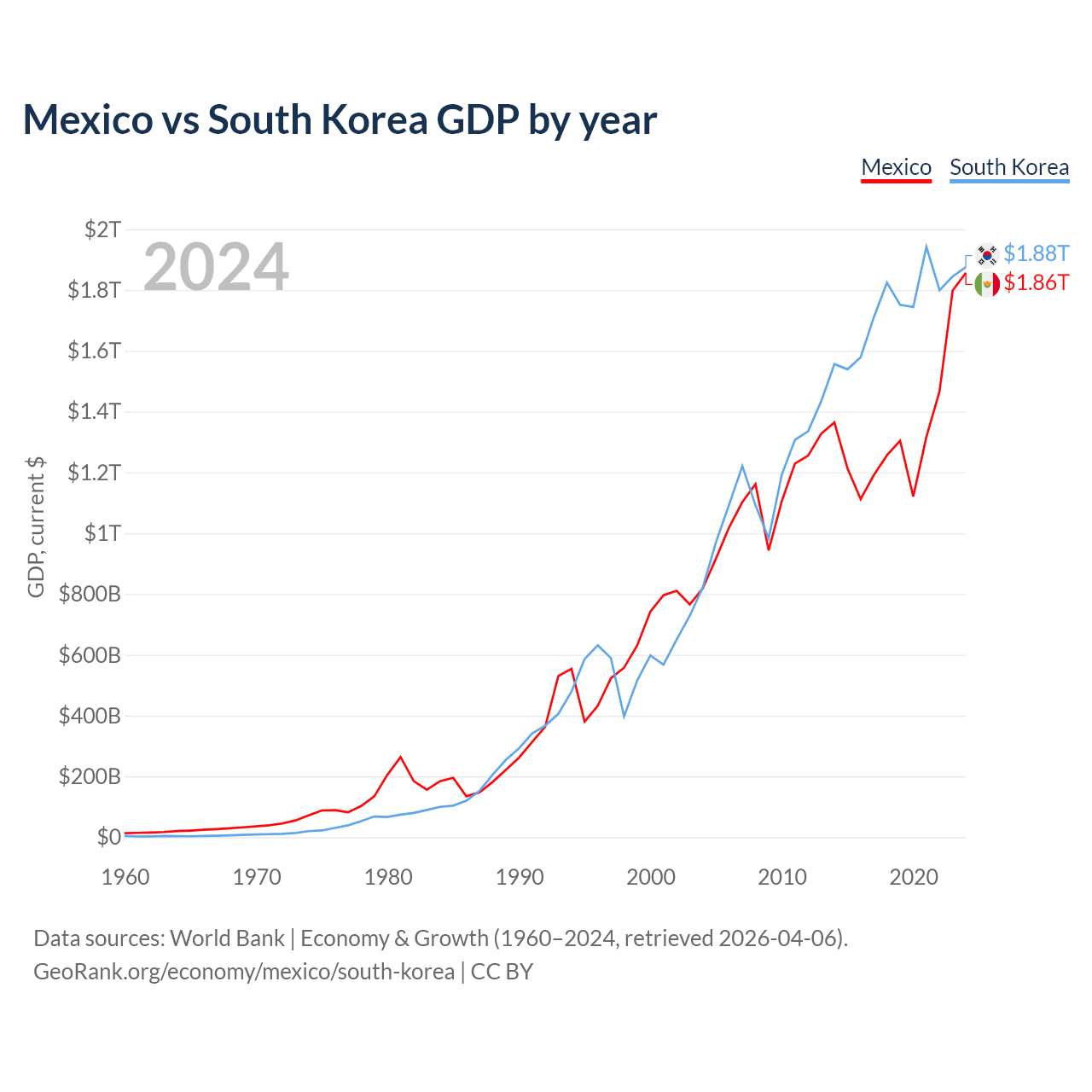 Mexico has a GDP of $1.86T compared to $1.88T for South Korea, ranking 13/197 and 12/197 by economy size, respectively.