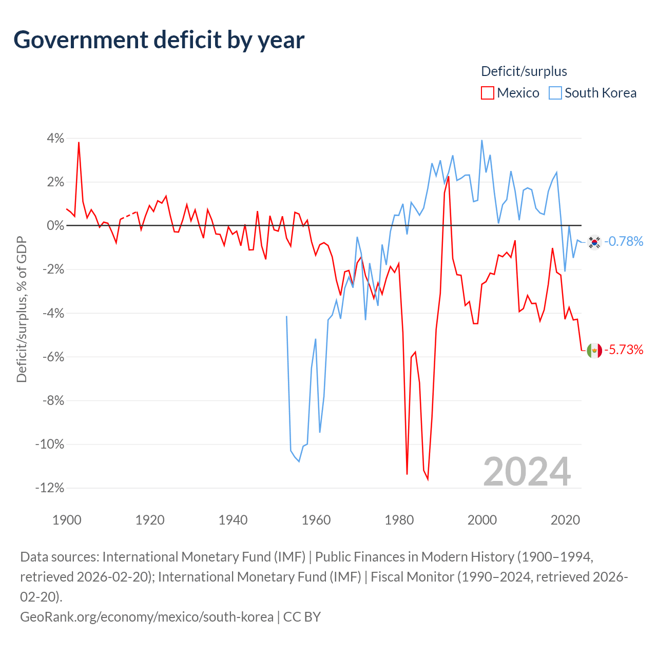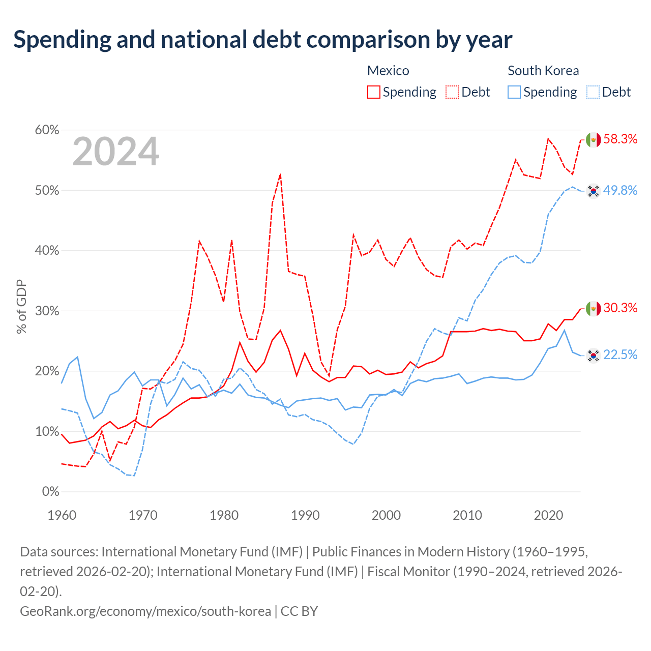 Mexico has $1.08T in government debt (58.3% of GDP), compared to $934B (49.8% of GDP) in South Korea.