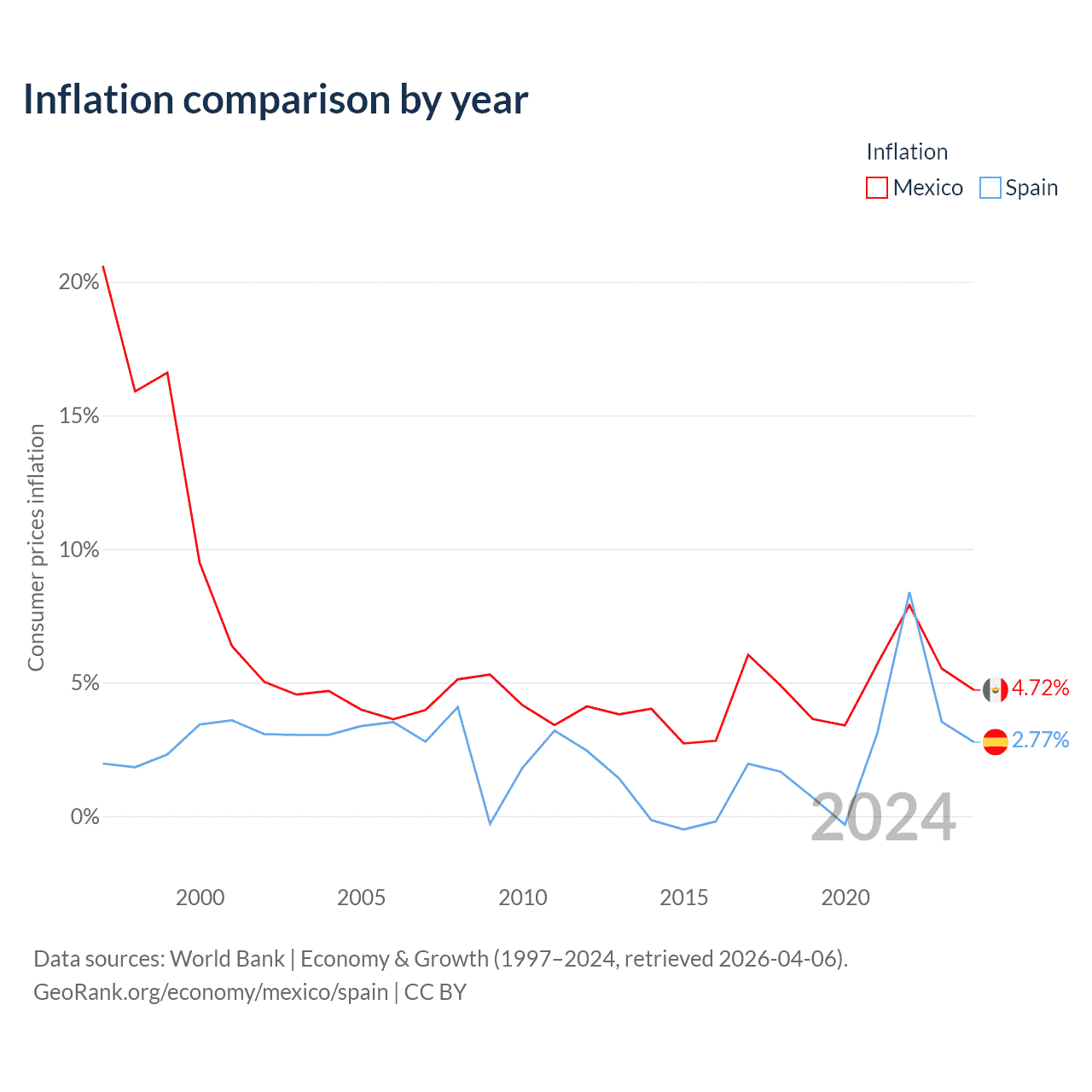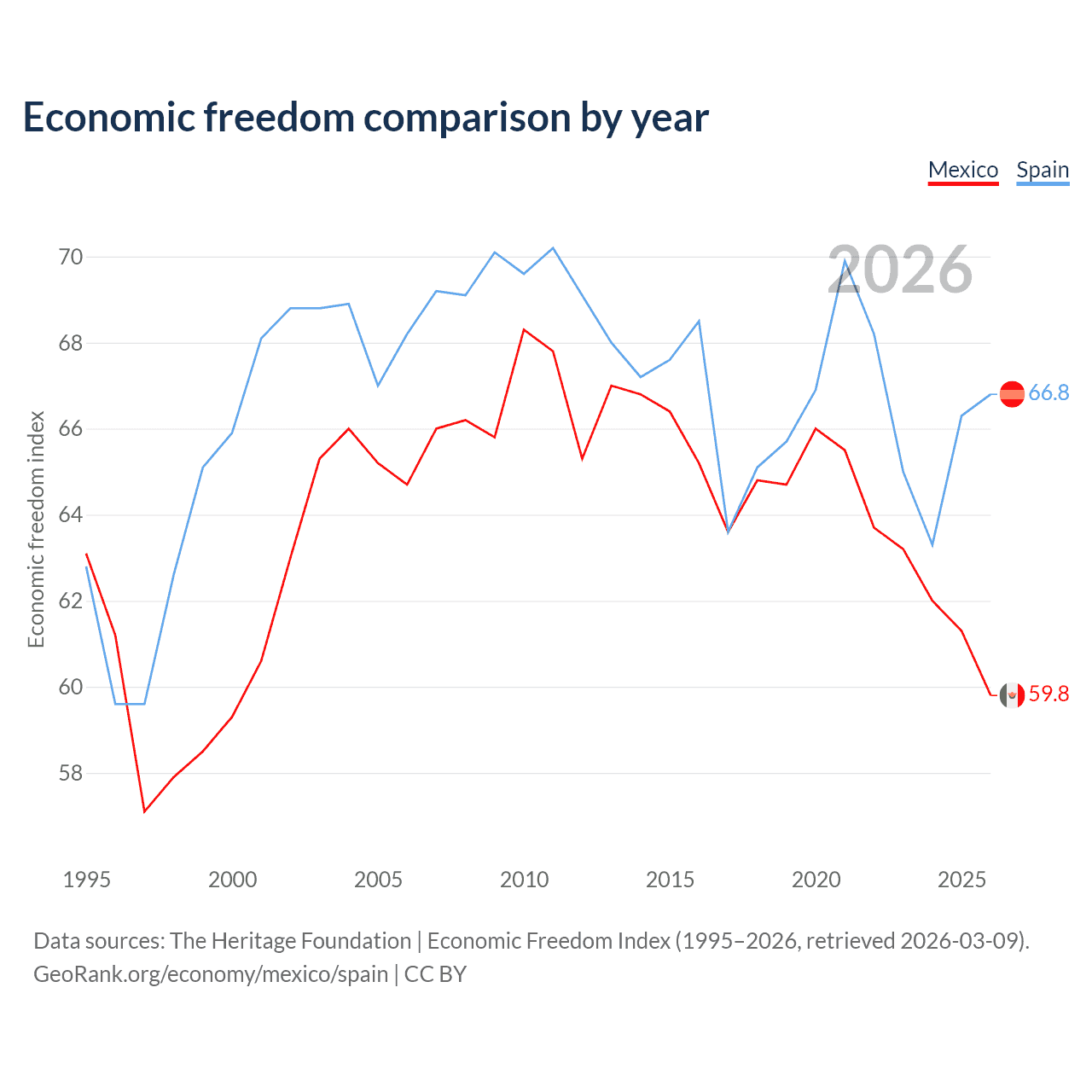The Economic Freedom Index for Mexico is 59.8, ranking 102/197, compared to 66.8 for Spain, ranking 59/197. The chart above displays a comparison of annual changes in economic freedom indexes.