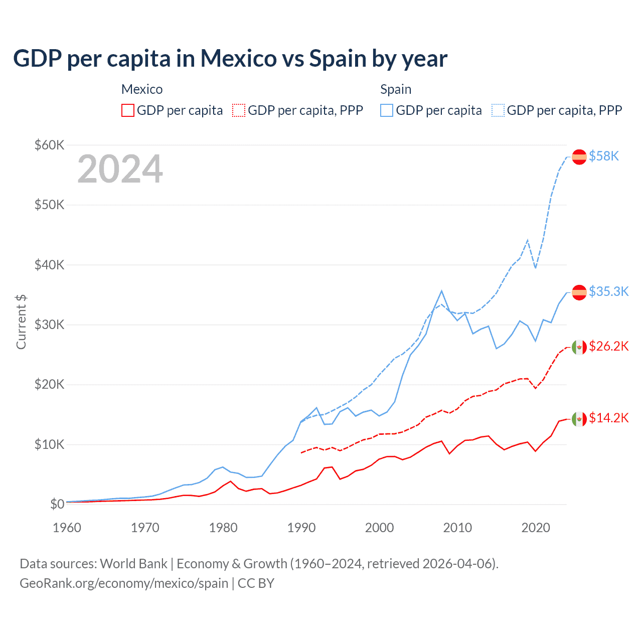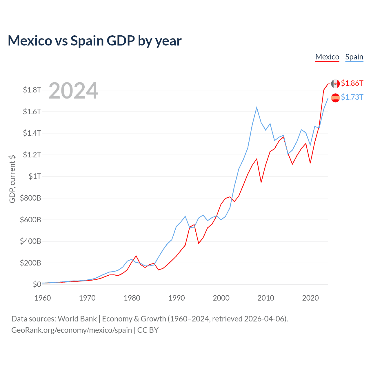 Mexico has a GDP of $1.86T compared to $1.73T for Spain, ranking 13/197 and 15/197 by economy size, respectively.