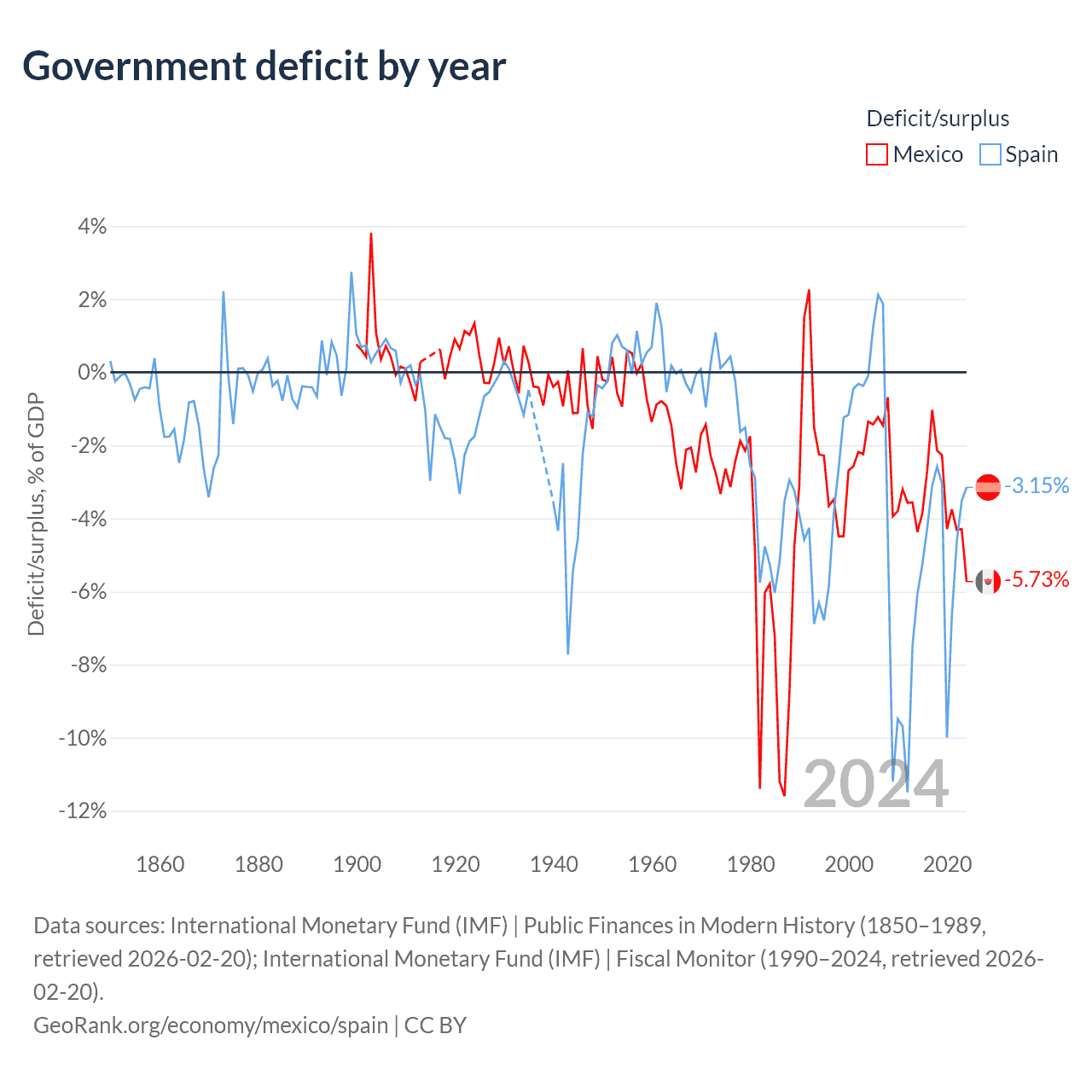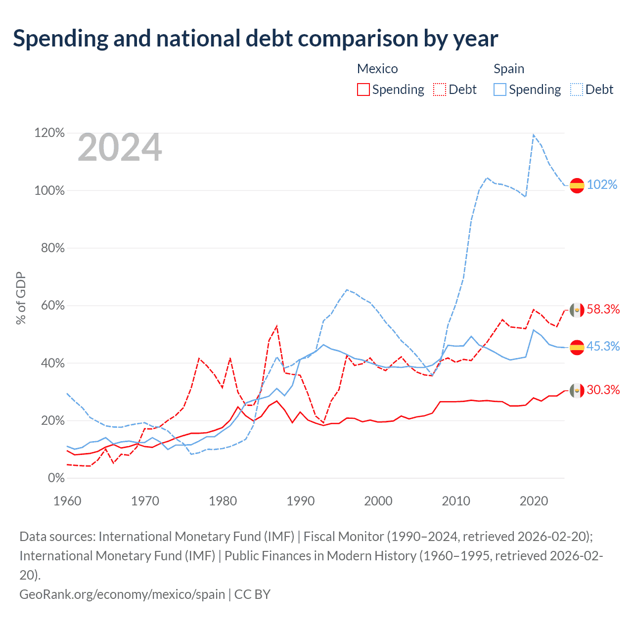 Mexico has $1.08T in government debt (58.3% of GDP), compared to $1.75T (101.6% of GDP) in Spain.