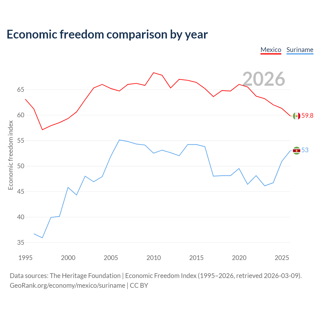 The Economic Freedom Index for Mexico is 59.8, ranking 102/197, compared to 53 for Suriname, ranking 143/197. The chart above displays a comparison of annual changes in economic freedom indexes.