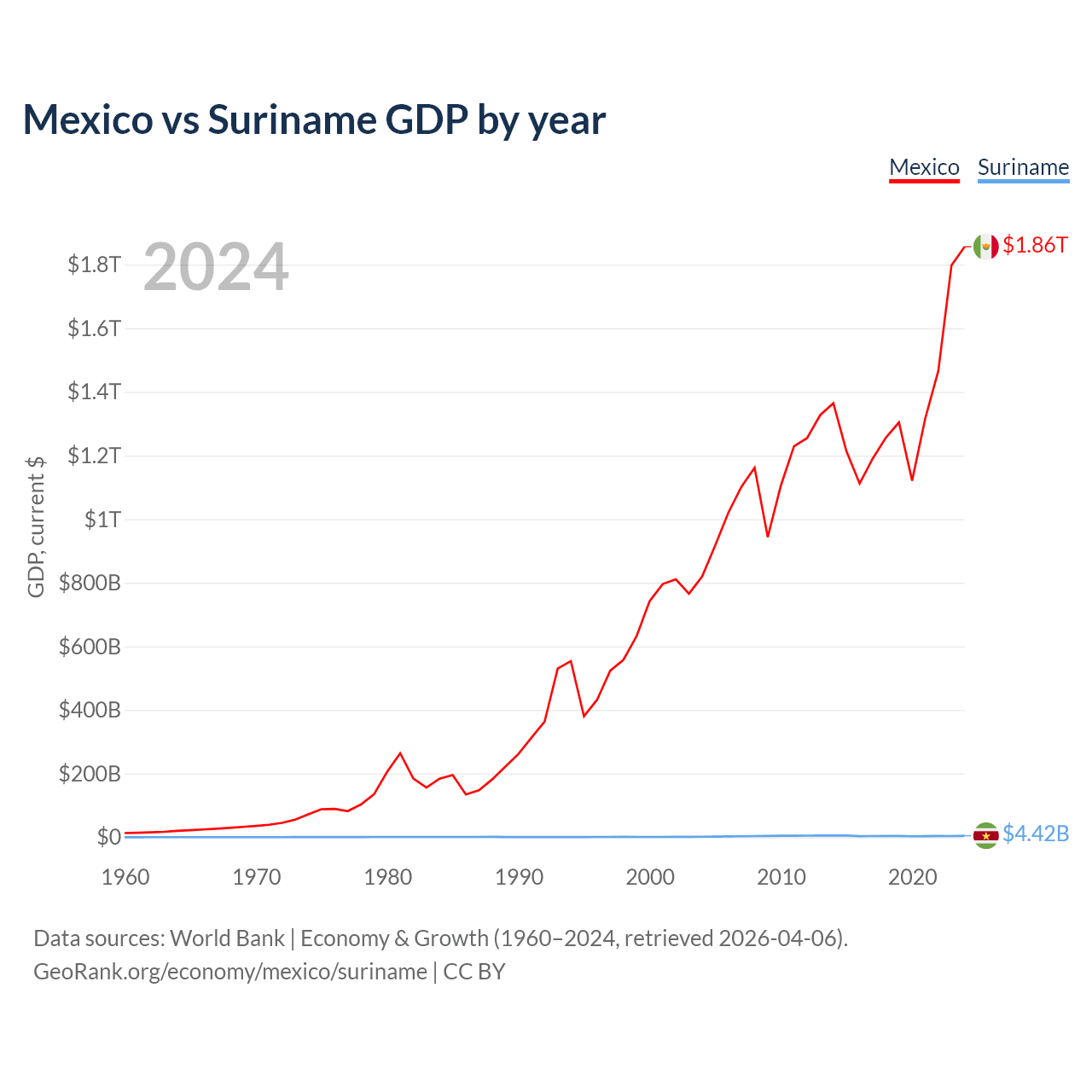 Mexico has a GDP of $1.86T compared to $4.42B for Suriname, ranking 13/197 and 164/197 by economy size, respectively.