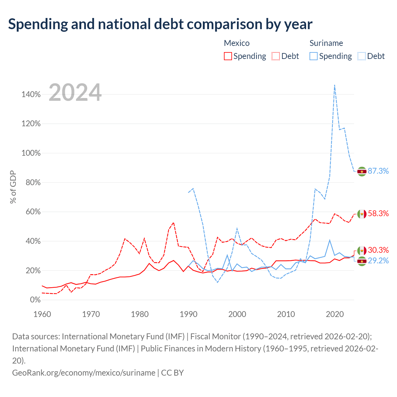 Mexico has $1.08T in government debt (58.3% of GDP), compared to $3.86B (87.3% of GDP) in Suriname.