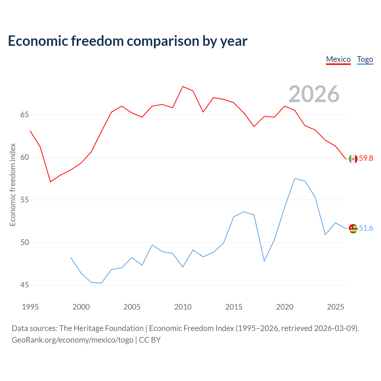 The Economic Freedom Index for Mexico is 59.8, ranking 102/197, compared to 51.6 for Togo, ranking 153/197. The chart above displays a comparison of annual changes in economic freedom indexes.