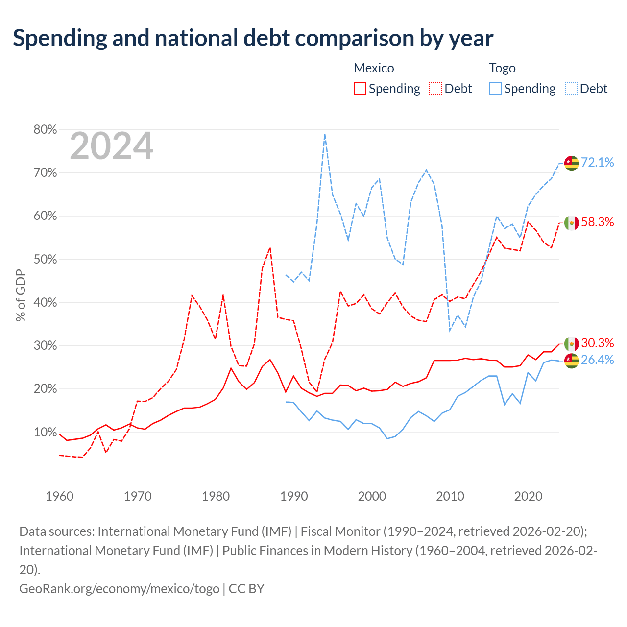 Mexico has $1.08T in government debt (58.3% of GDP), compared to $7.68B (72.1% of GDP) in Togo.