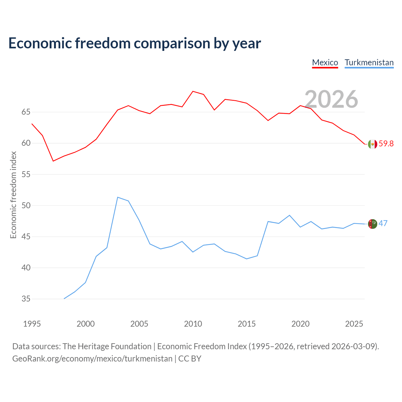 The Economic Freedom Index for Mexico is 59.8, ranking 102/197, compared to 47 for Turkmenistan, ranking 177/197. The chart above displays a comparison of annual changes in economic freedom indexes.