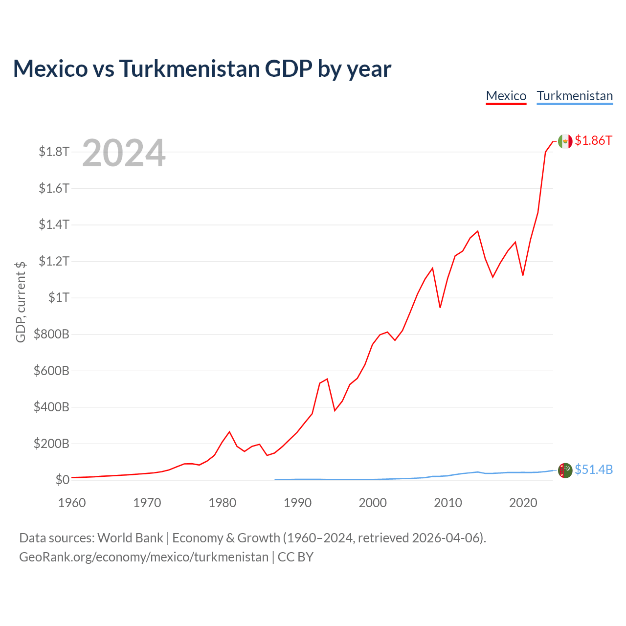 Mexico has a GDP of $1.86T compared to $51.4B for Turkmenistan, ranking 13/197 and 92/197 by economy size, respectively.