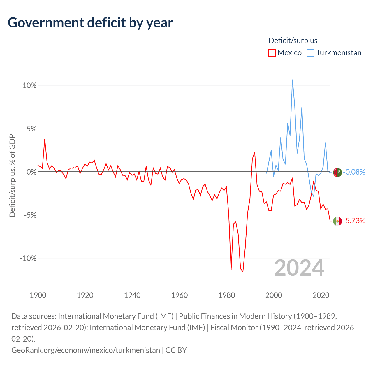 Mexico has $1.08T in government debt (58.3% of GDP), compared to $2.11B (4.11% of GDP) in Turkmenistan.