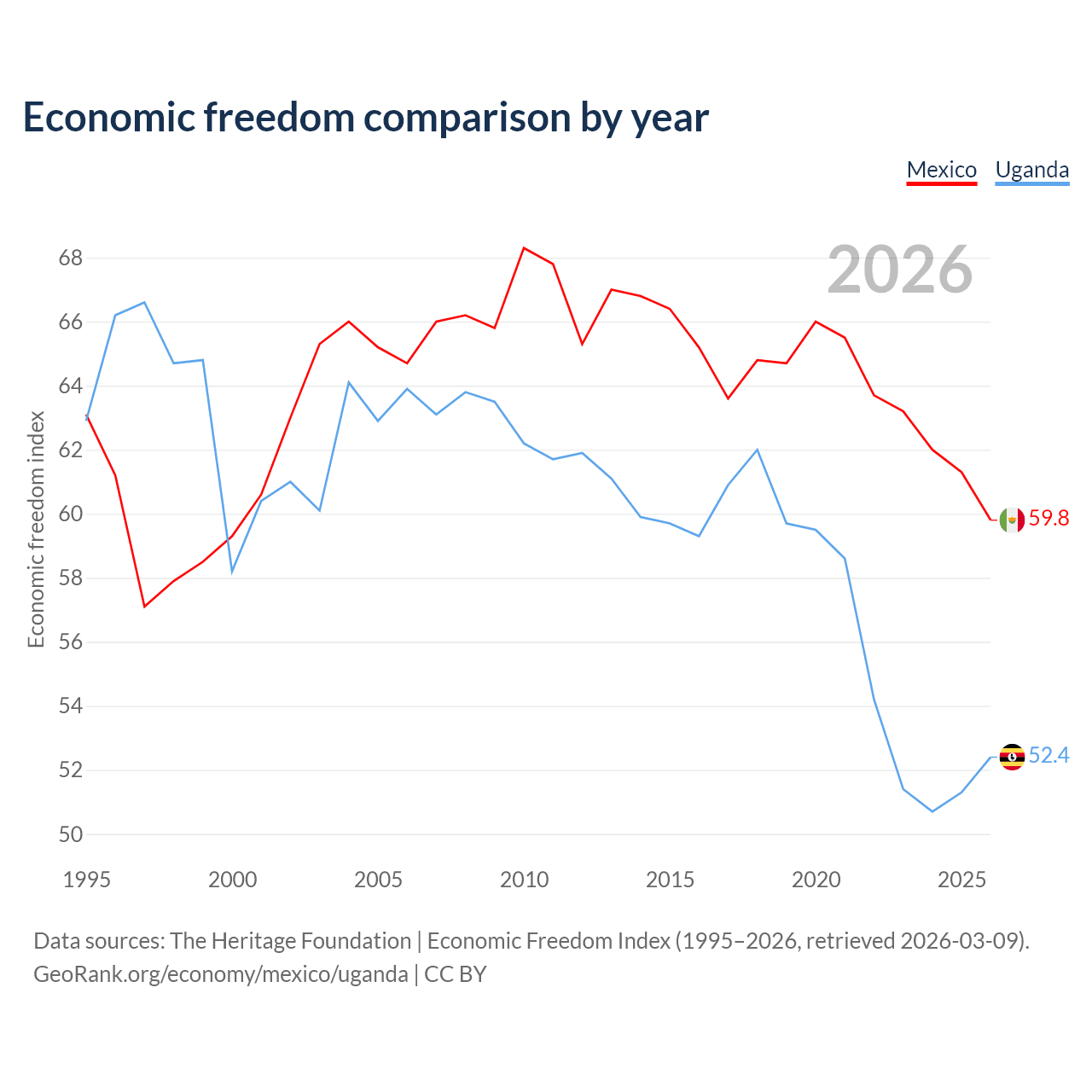 The Economic Freedom Index for Mexico is 59.8, ranking 102/197, compared to 52.4 for Uganda, ranking 149/197. The chart above displays a comparison of annual changes in economic freedom indexes.
