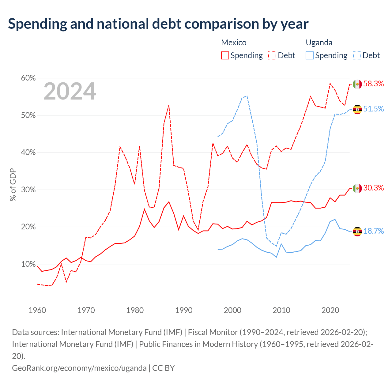 Mexico has $1.08T in government debt (58.3% of GDP), compared to $27.8B (51.5% of GDP) in Uganda.