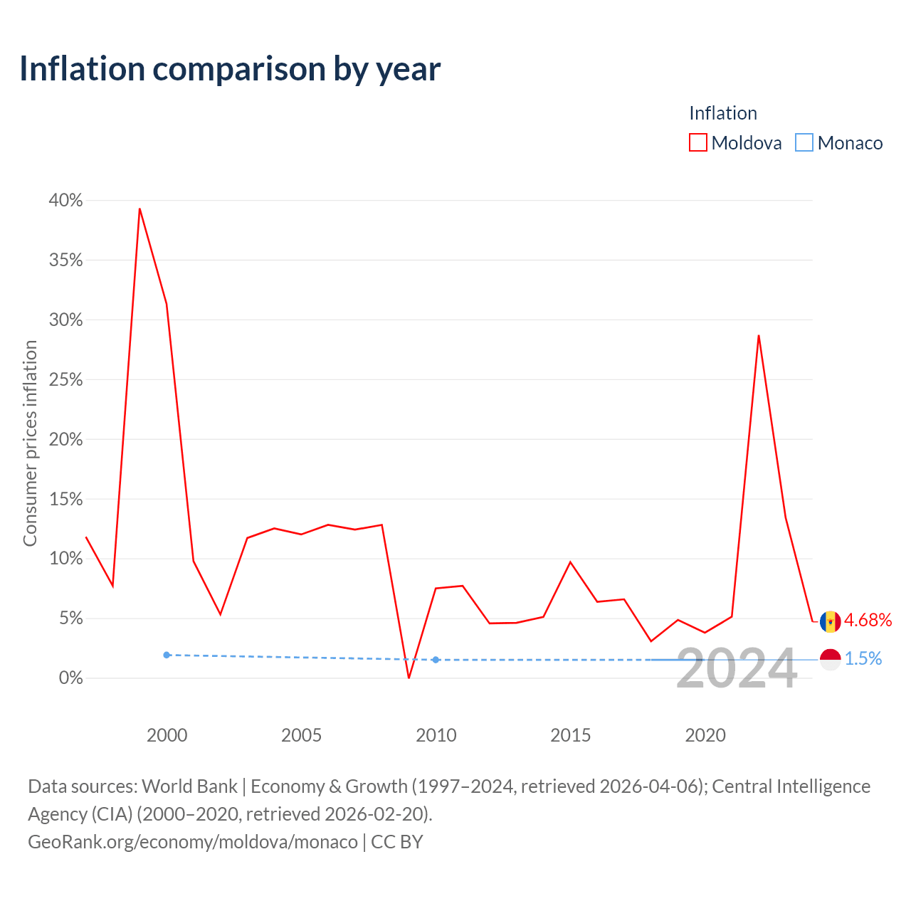 Over the past 21 years, Moldova has recorded an average annual inflation rate of 8.77%, compared with 1.58% in Monaco. In 2020, inflation was 4.68% in Moldova and 1.5% in Monaco.