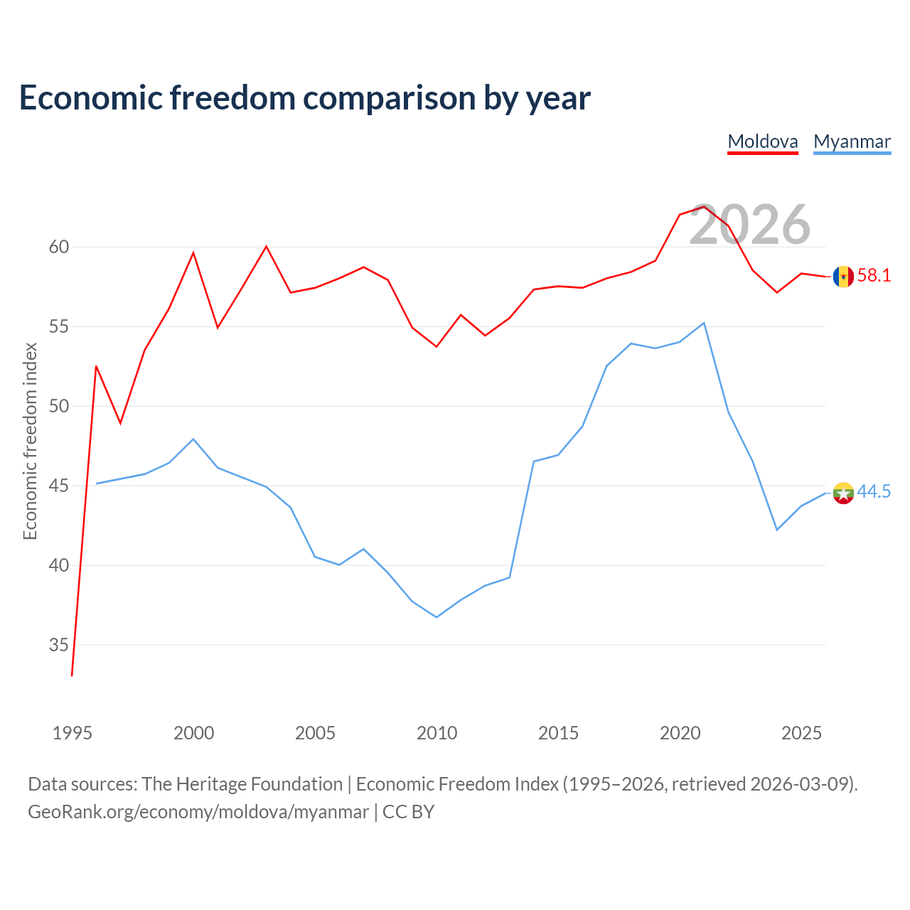 The Economic Freedom Index for Moldova is 58.1, ranking 112/197, compared to 44.5 for Myanmar, ranking 180/197. The chart above displays a comparison of annual changes in economic freedom indexes.