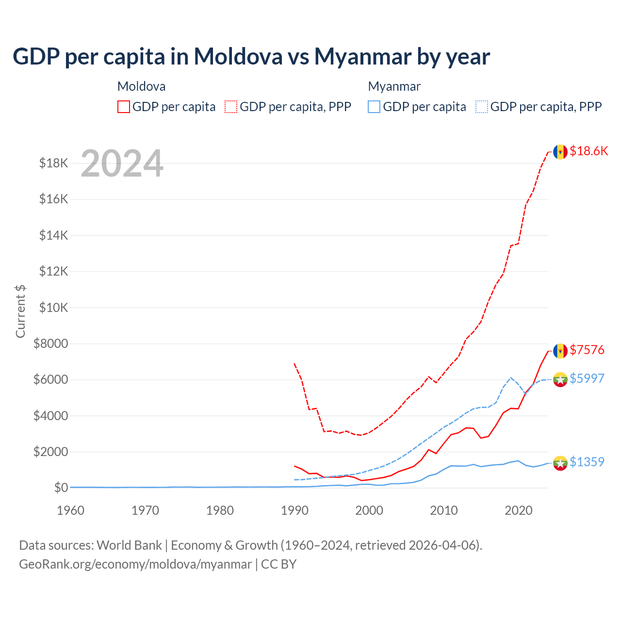GDP per capita in Moldova vs Myanmar by year