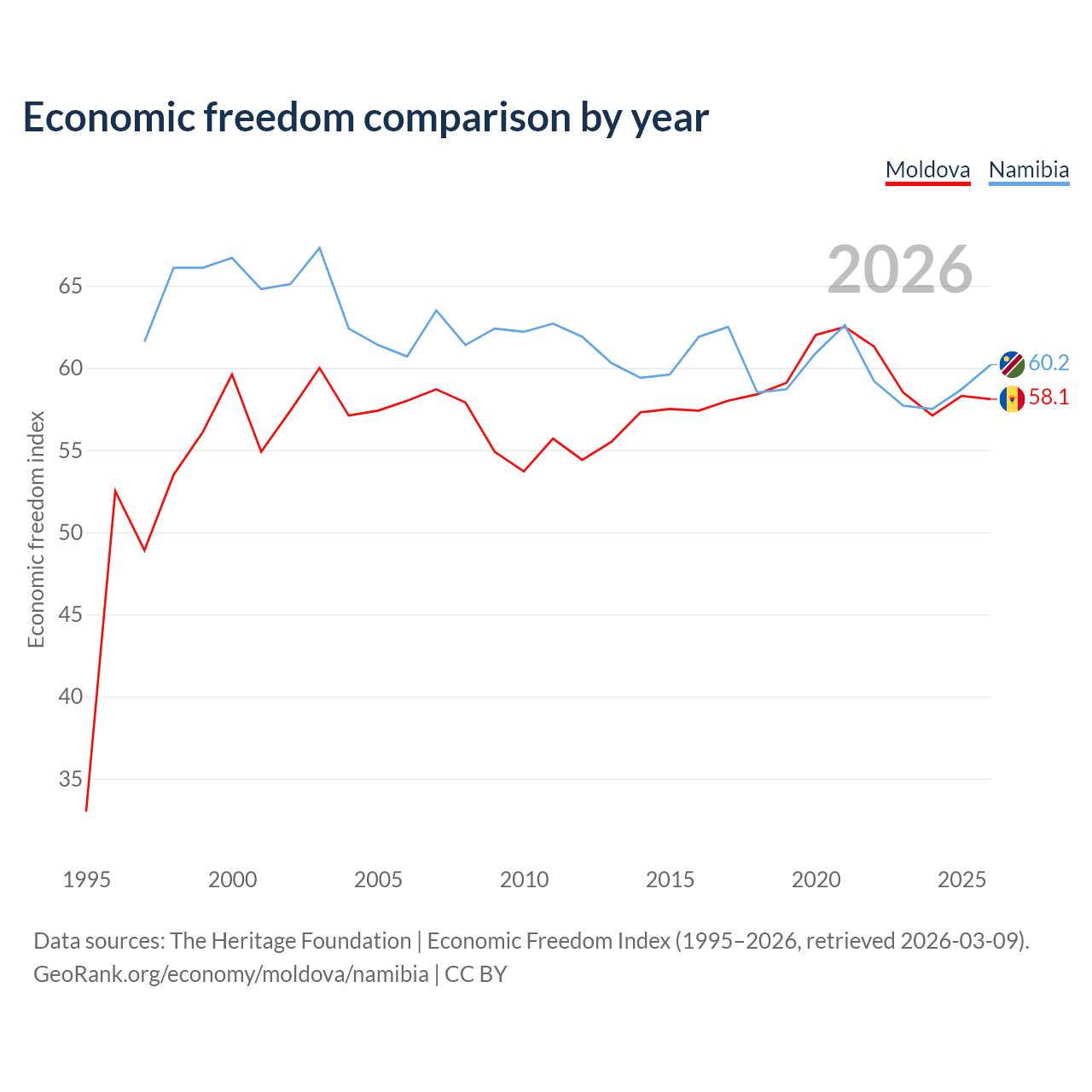 The Economic Freedom Index for Moldova is 58.1, ranking 112/197, compared to 60.2 for Namibia, ranking 95/197. The chart above displays a comparison of annual changes in economic freedom indexes.