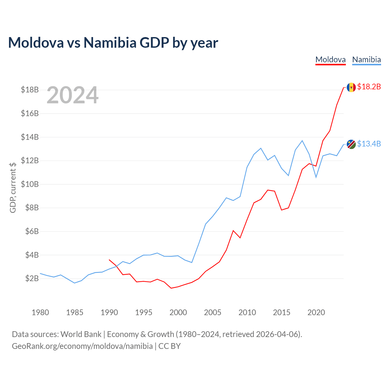 Moldova has a GDP of $18.2B compared to $13.4B for Namibia, ranking 134/197 and 147/197 by economy size, respectively.