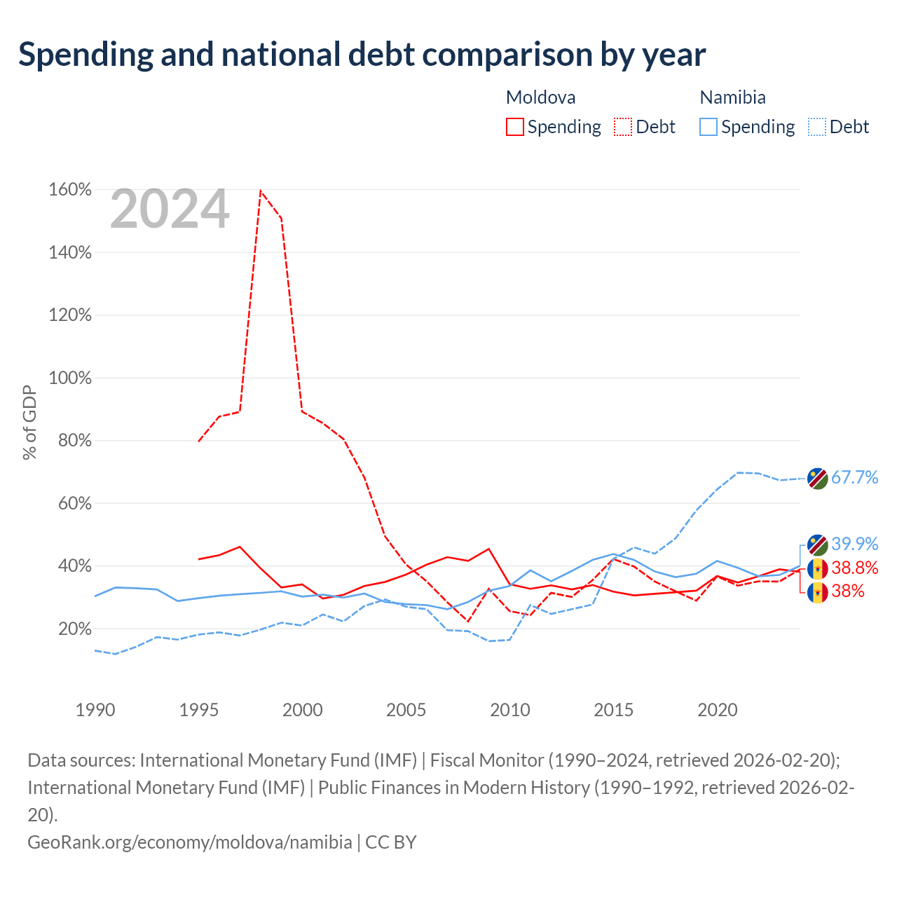 Moldova has $7.06B in government debt (38.8% of GDP), compared to $9.05B (67.7% of GDP) in Namibia.