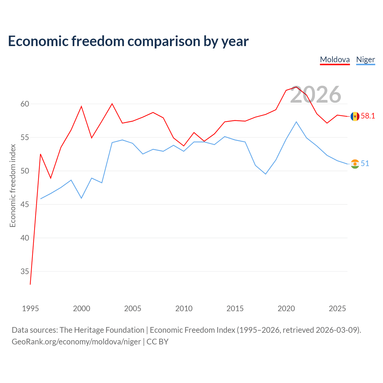 The Economic Freedom Index for Moldova is 58.1, ranking 112/197, compared to 51 for Niger, ranking 156/197. The chart above displays a comparison of annual changes in economic freedom indexes.