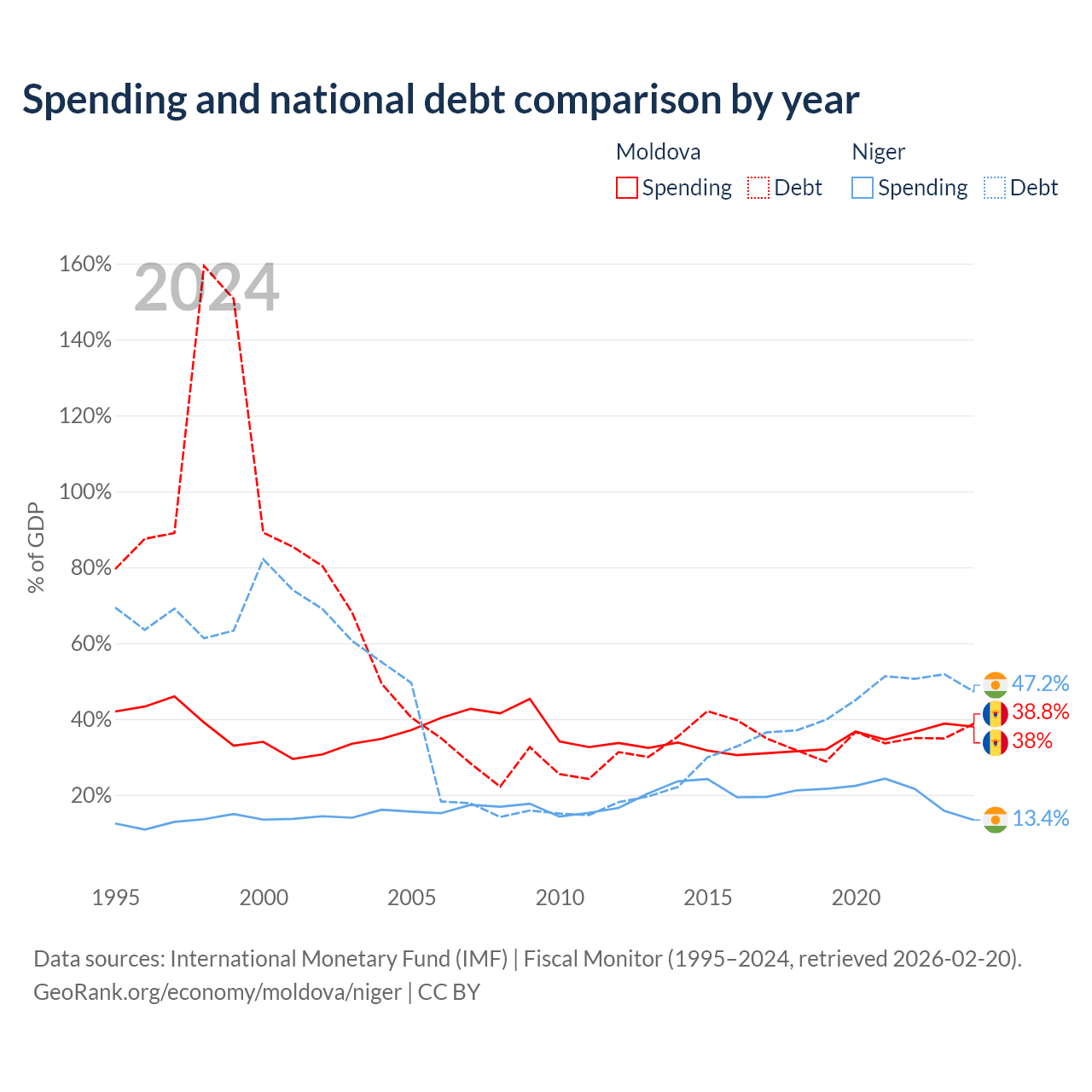 Moldova has $7.06B in government debt (38.8% of GDP), compared to $9.39B (47.2% of GDP) in Niger.