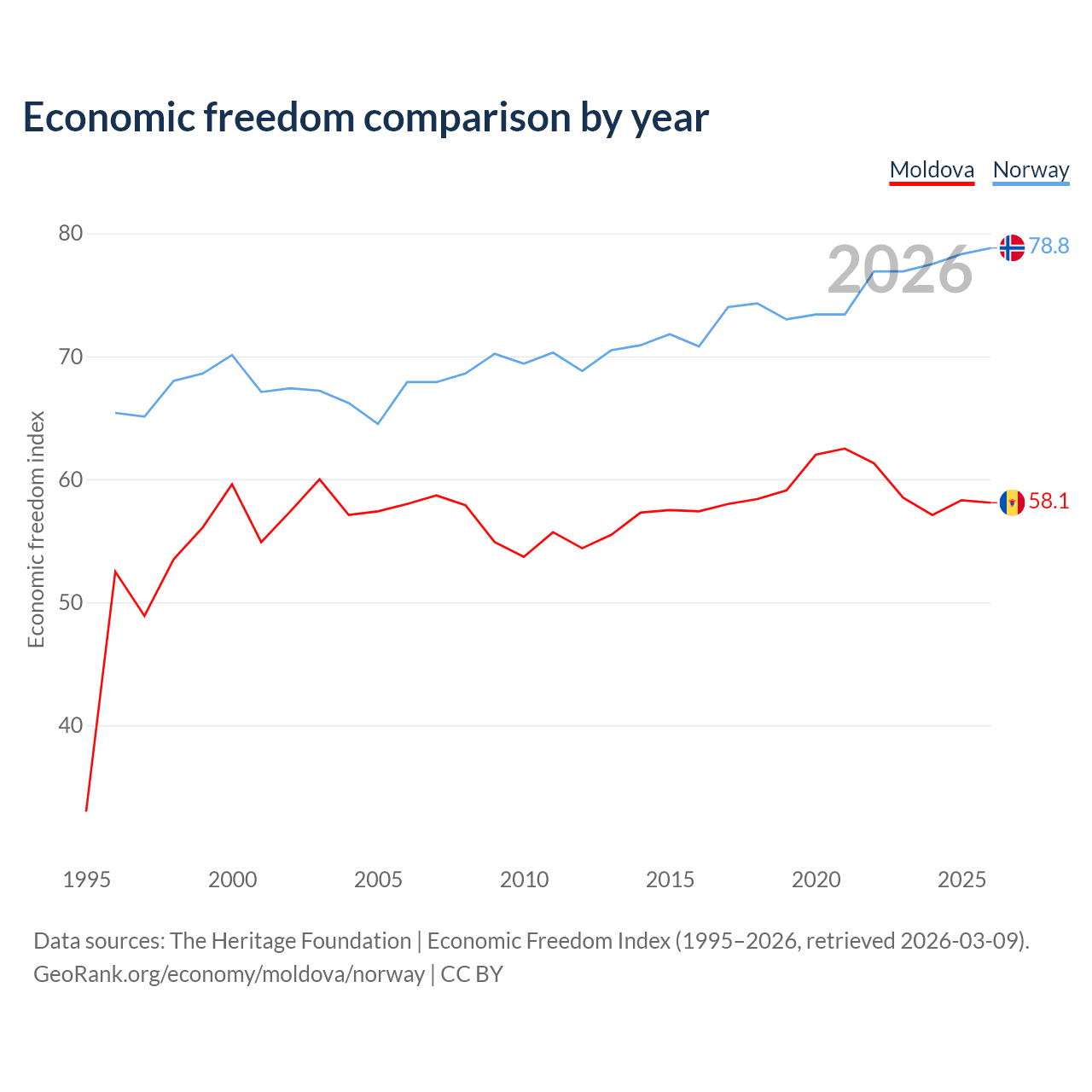 The Economic Freedom Index for Moldova is 58.1, ranking 112/197, compared to 78.8 for Norway, ranking 9/197. The chart above displays a comparison of annual changes in economic freedom indexes.