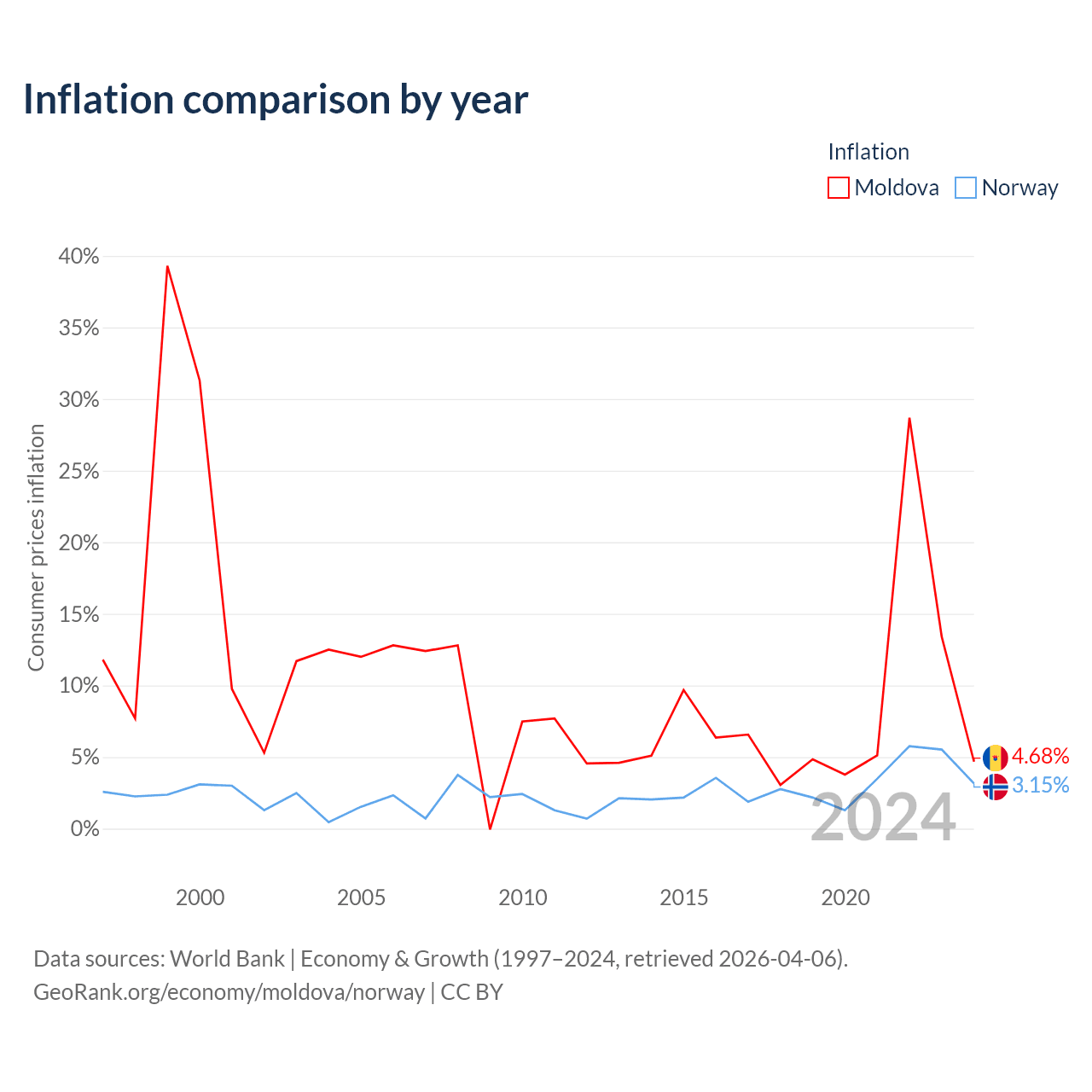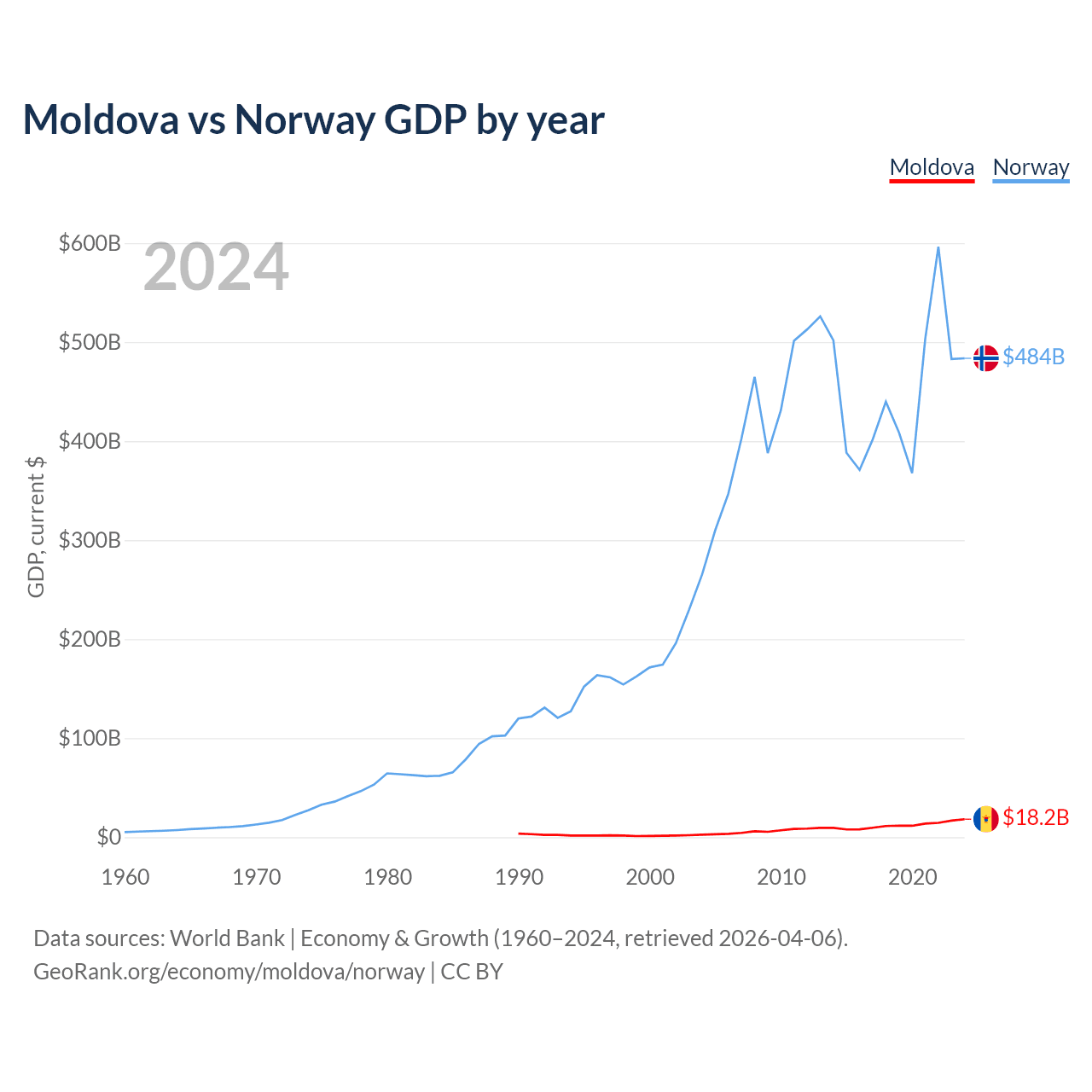 Moldova has a GDP of $18.2B compared to $484B for Norway, ranking 134/197 and 32/197 by economy size, respectively.