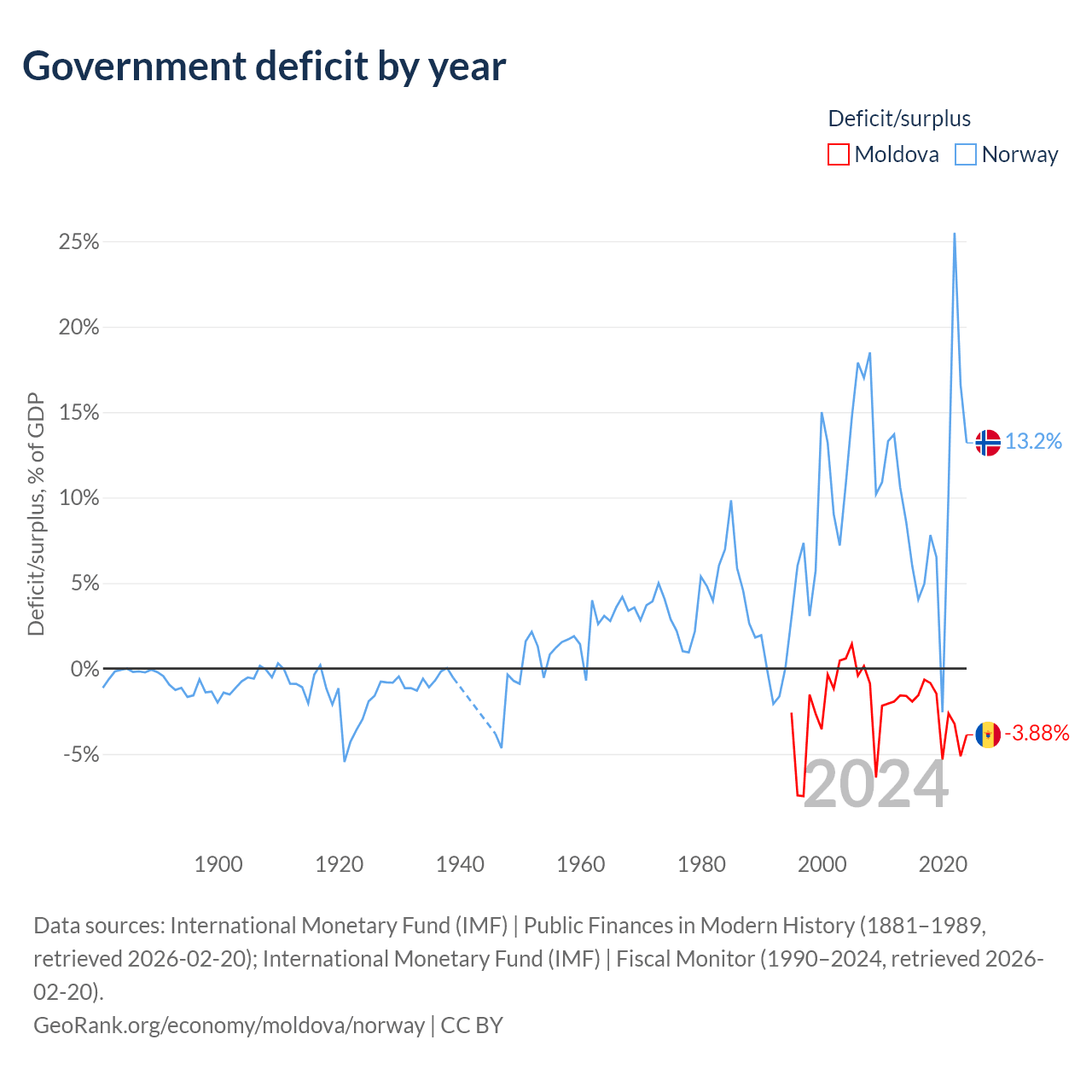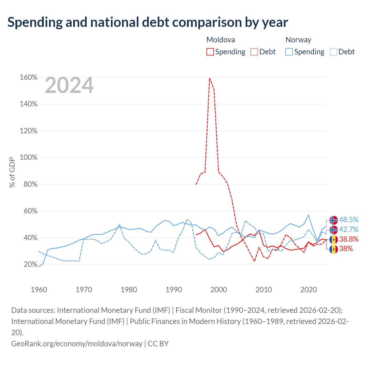Moldova has $7.06B in government debt (38.8% of GDP), compared to $207B (42.7% of GDP) in Norway.