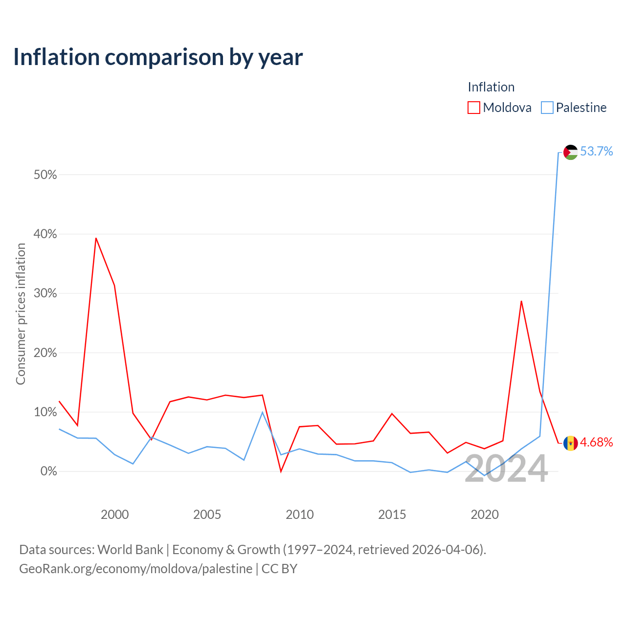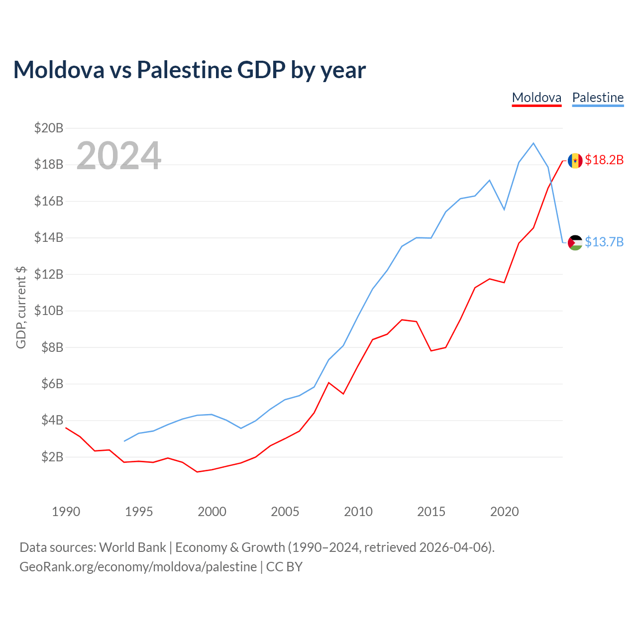 Moldova has a GDP of $18.2B compared to $13.7B for Palestine, ranking 134/197 and 146/197 by economy size, respectively.