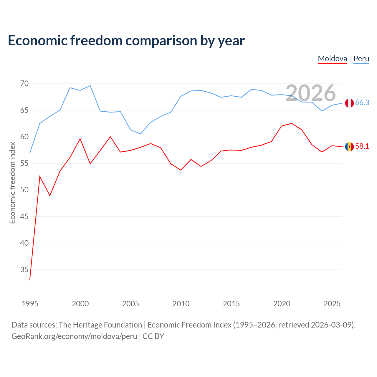 The Economic Freedom Index for Moldova is 58.1, ranking 112/197, compared to 66.3 for Peru, ranking 62/197. The chart above displays a comparison of annual changes in economic freedom indexes.