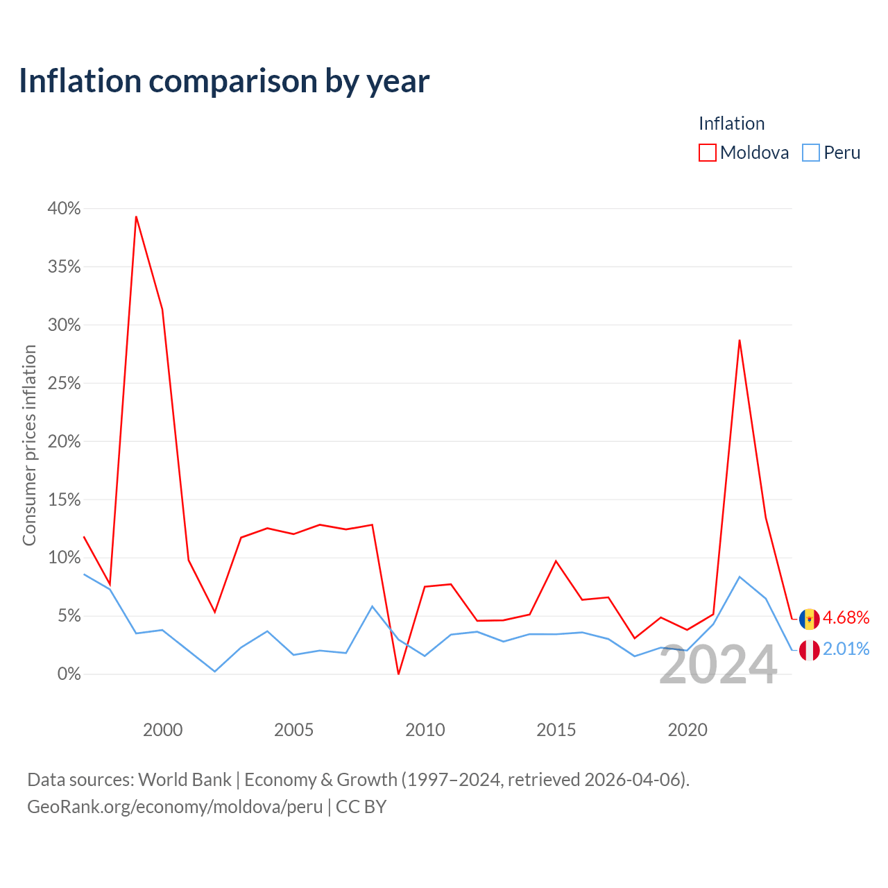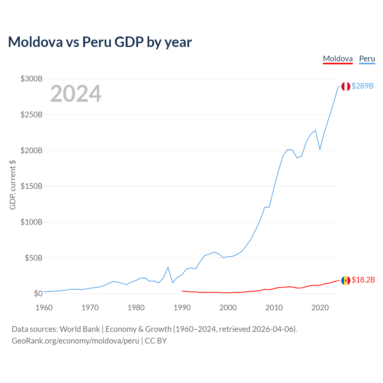 Moldova has a GDP of $18.2B compared to $289B for Peru, ranking 134/197 and 49/197 by economy size, respectively.