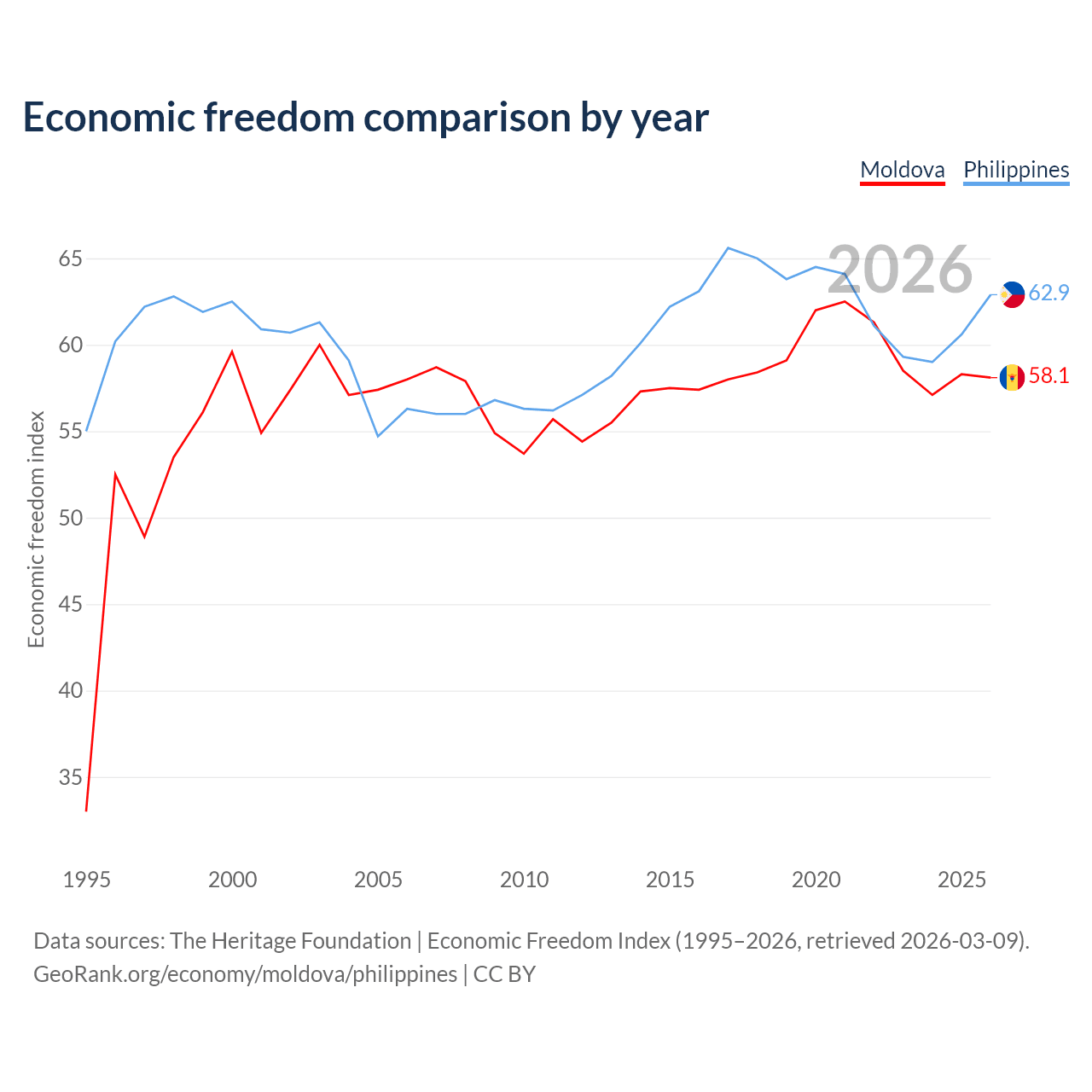 The Economic Freedom Index for Moldova is 58.1, ranking 112/197, compared to 62.9 for the Philippines, ranking 85/197. The chart above displays a comparison of annual changes in economic freedom indexes.