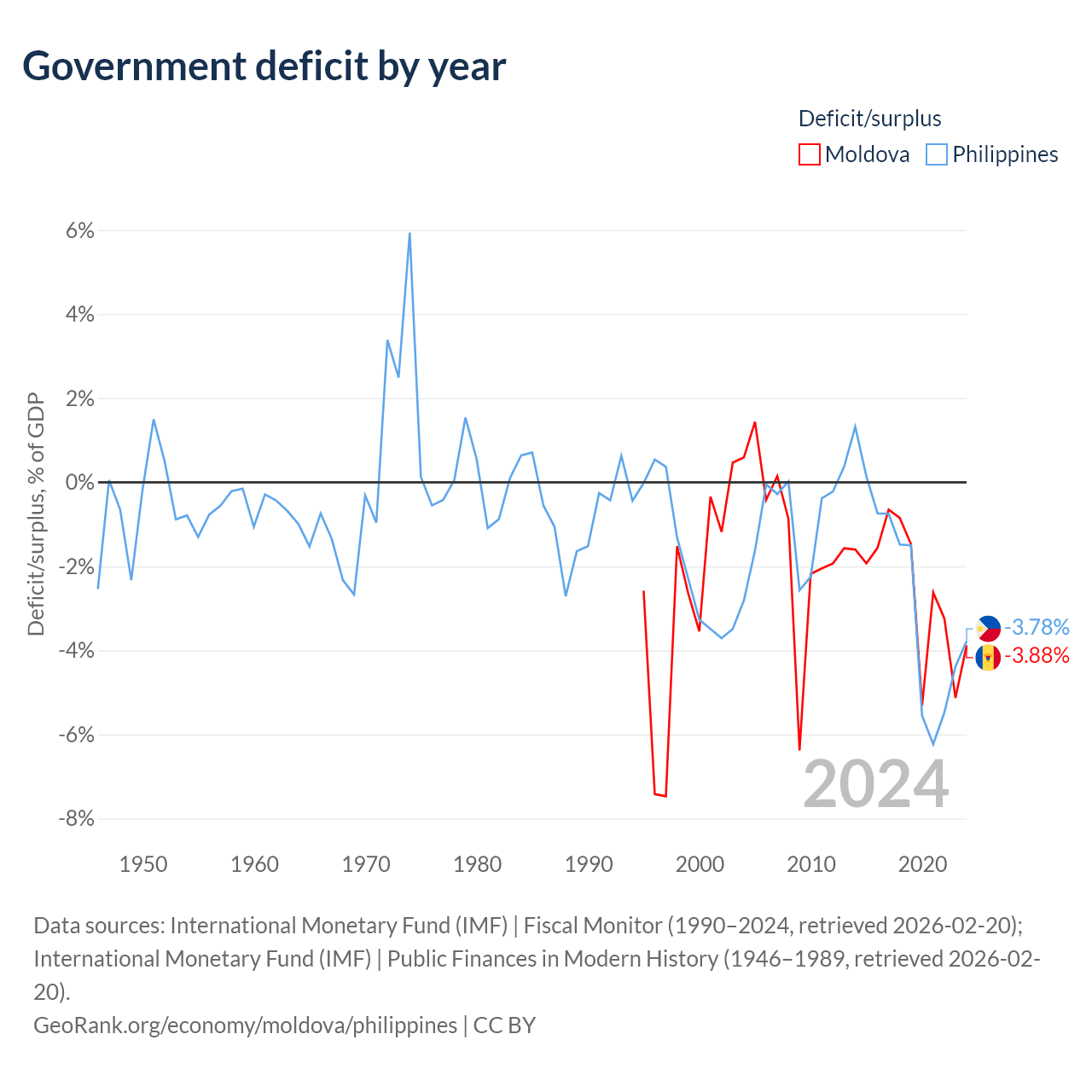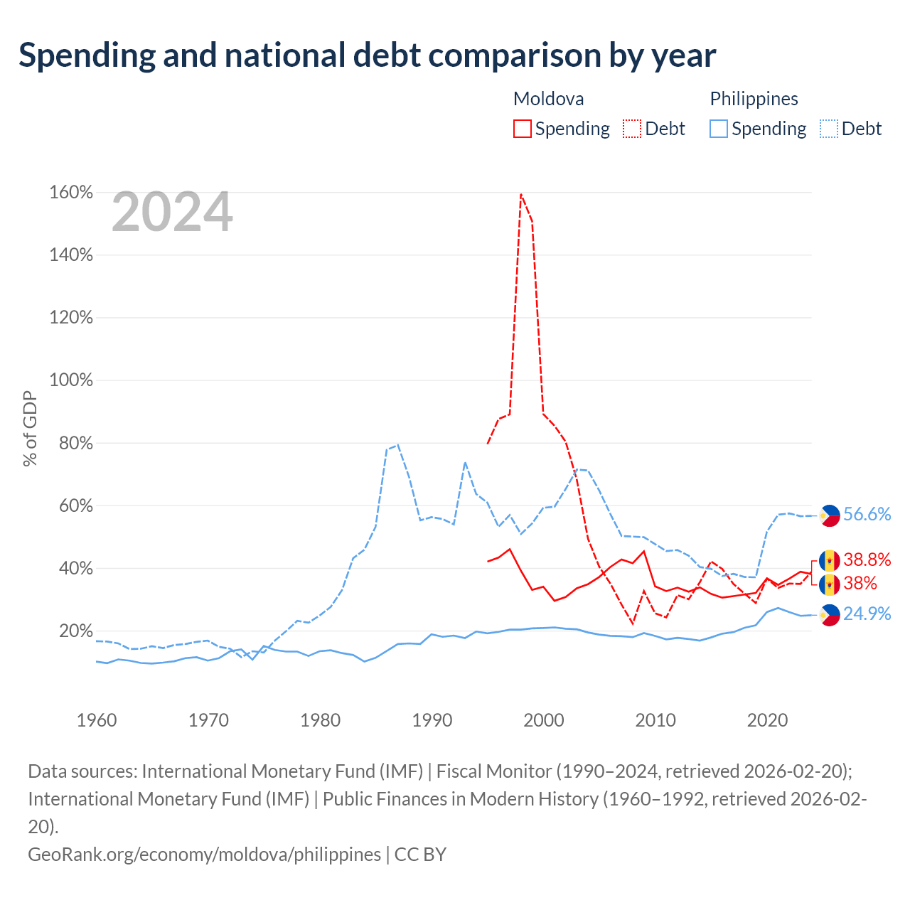 Moldova has $7.06B in government debt (38.8% of GDP), compared to $261B (56.6% of GDP) in the Philippines.
