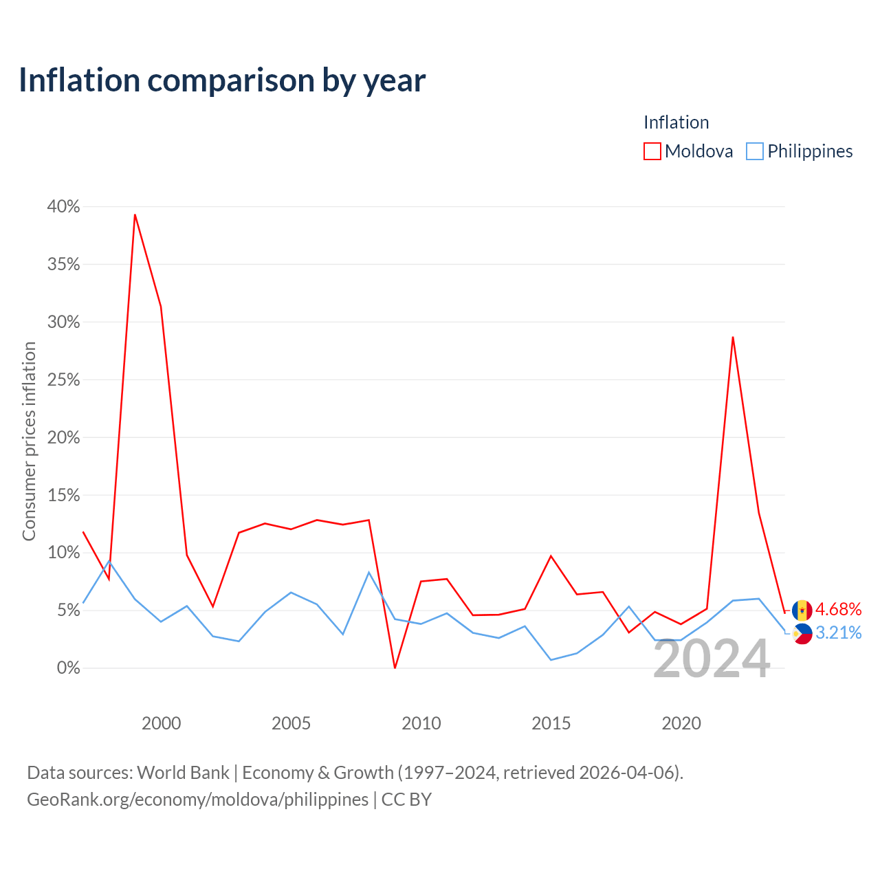Moldova has a GDP of $18.2B compared to $462B for the Philippines, ranking 134/197 and 35/197 by economy size, respectively.