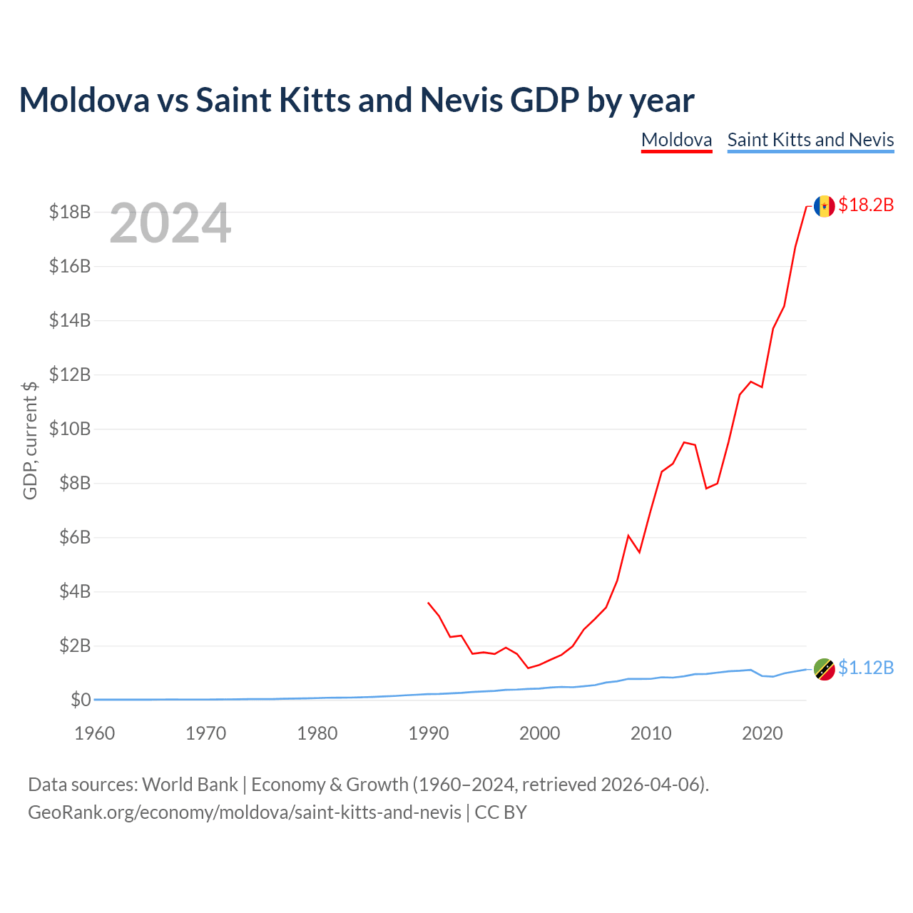 Moldova has a GDP of $18.2B compared to $1.12B for Saint Kitts and Nevis, ranking 134/197 and 187/197 by economy size, respectively.