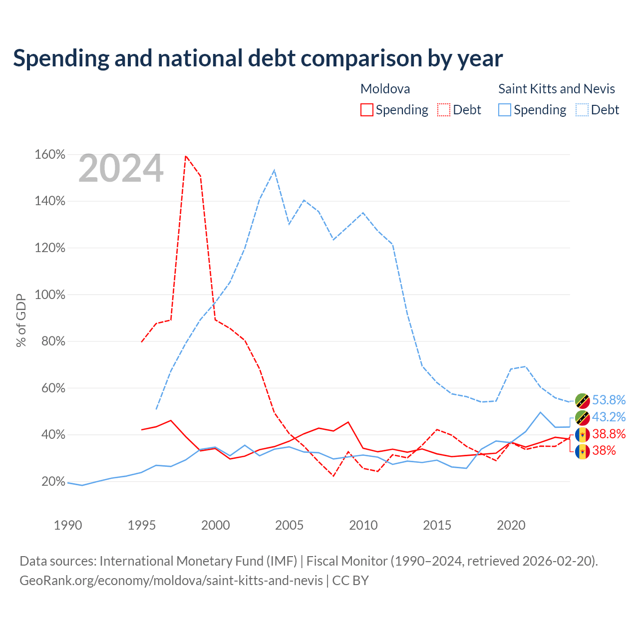 Moldova has $7.06B in government debt (38.8% of GDP), compared to $604M (53.8% of GDP) in Saint Kitts and Nevis.