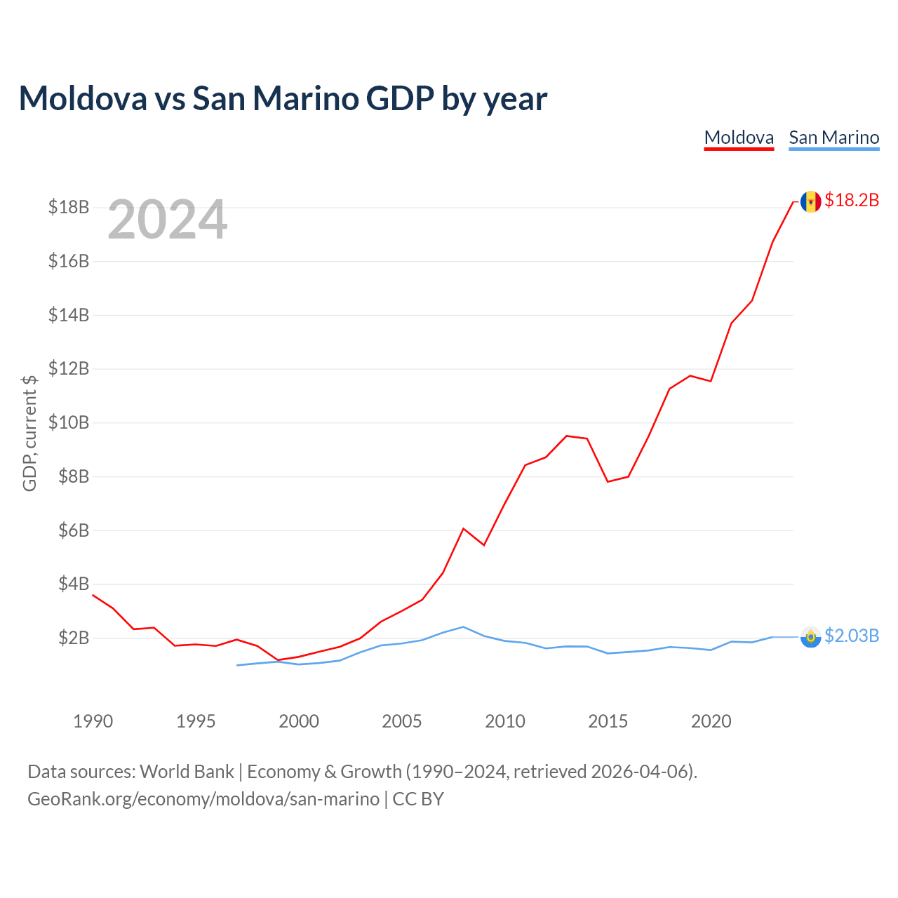 Moldova has a GDP of $18.2B compared to $2.03B for San Marino, ranking 134/197 and 180/197 by economy size, respectively.