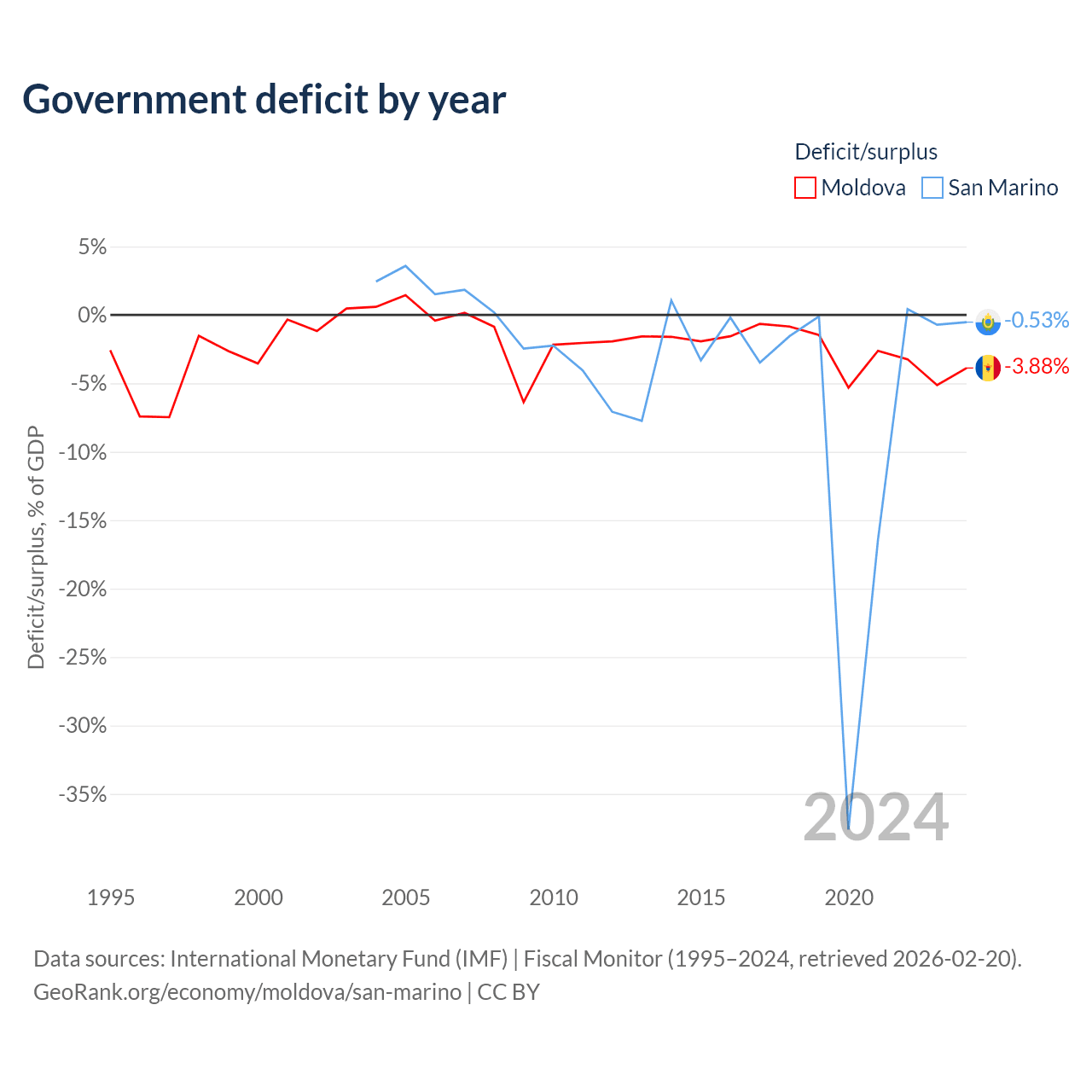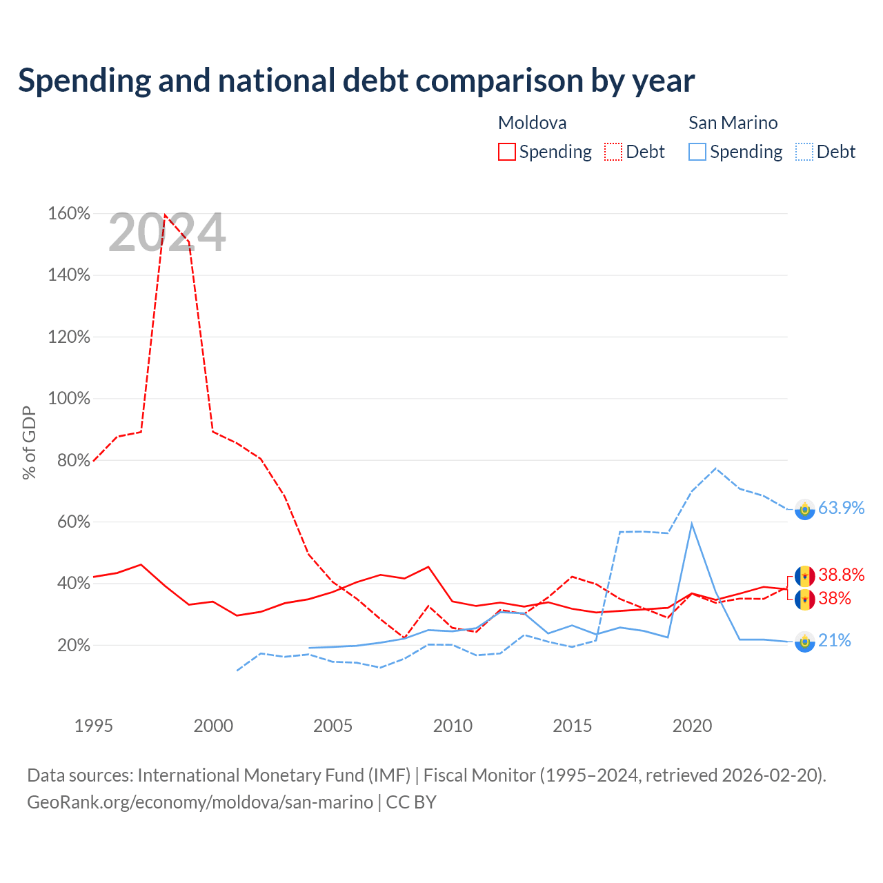 Moldova has $7.06B in government debt (38.8% of GDP), compared to $1.39B (63.9% of GDP) in San Marino.