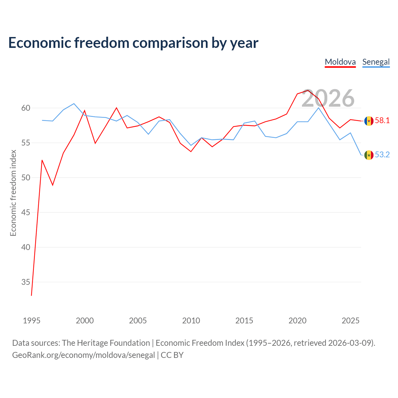 The Economic Freedom Index for Moldova is 58.1, ranking 112/197, compared to 53.2 for Senegal, ranking 140/197. The chart above displays a comparison of annual changes in economic freedom indexes.