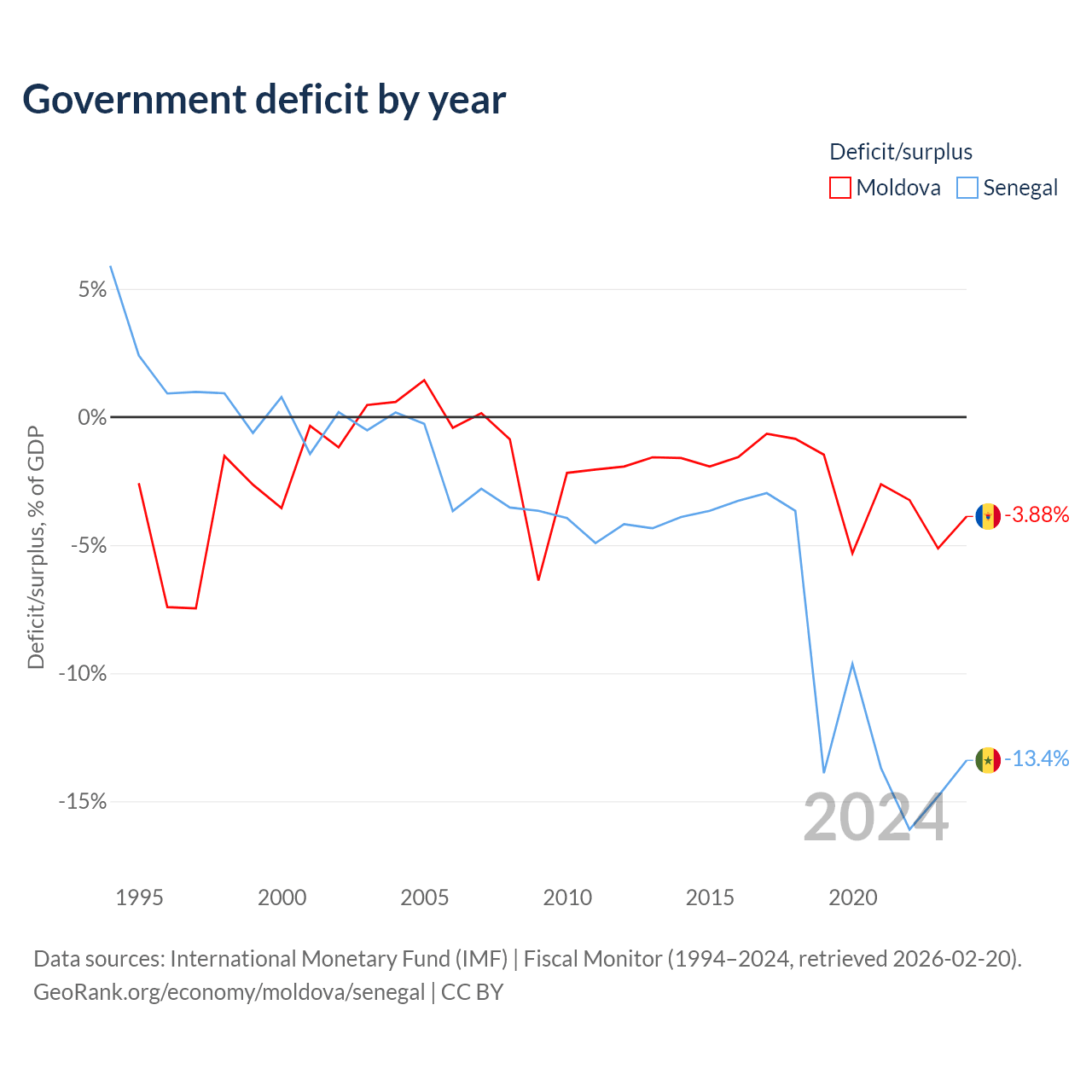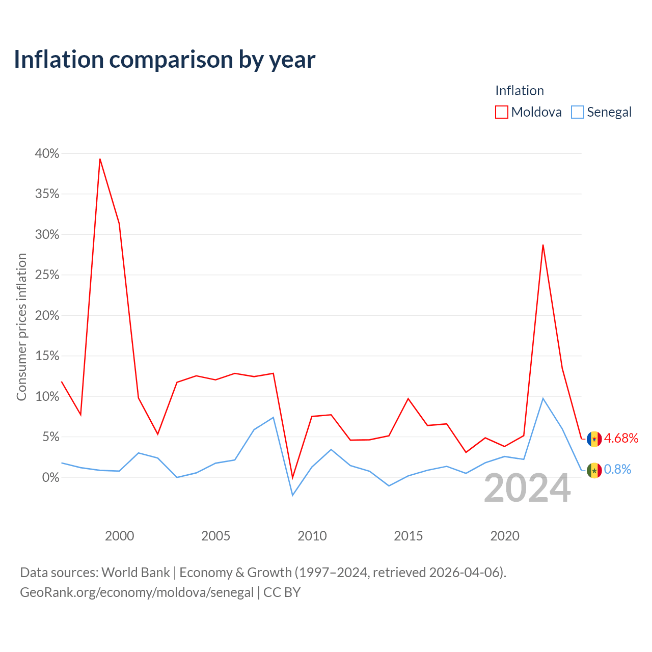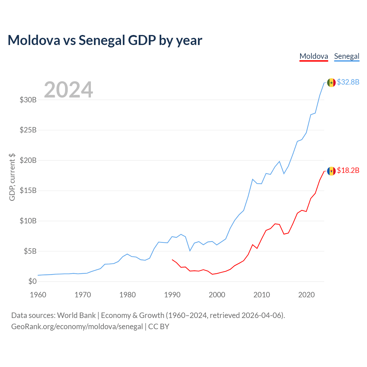 Moldova has a GDP of $18.2B compared to $32.8B for Senegal, ranking 134/197 and 109/197 by economy size, respectively.